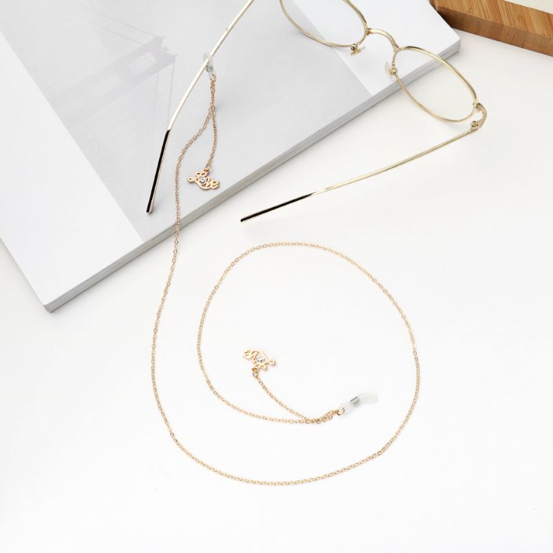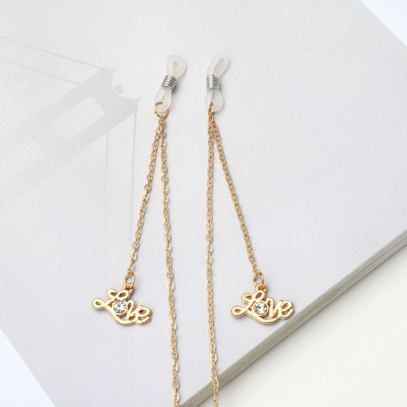 Gold-colored metal non-slip chain, with LOVE text and rhinestones, for glasses and masks GA030