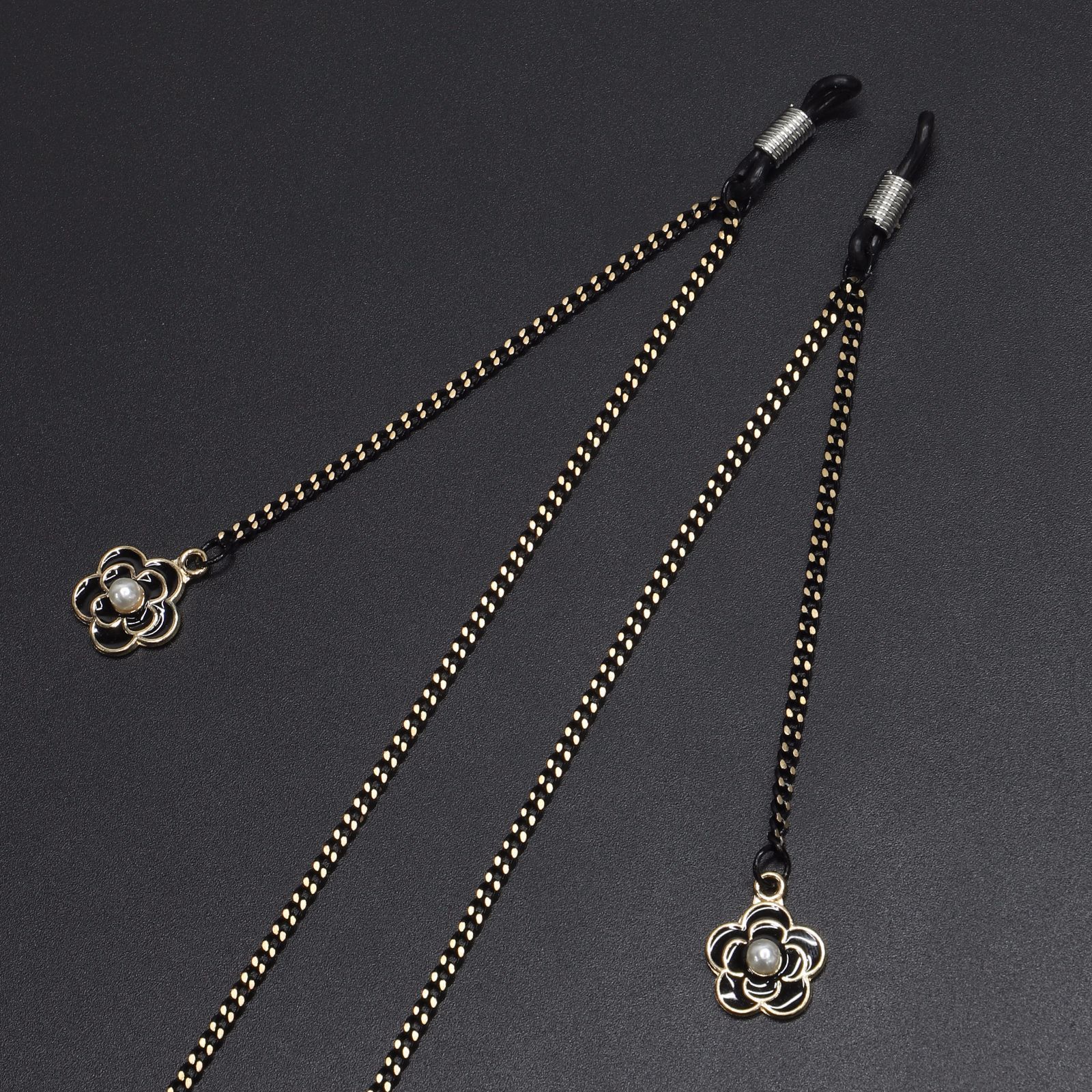 Black-colored metal non-slip chain, with pendant black flower and pearl, for glasses and masks GL490