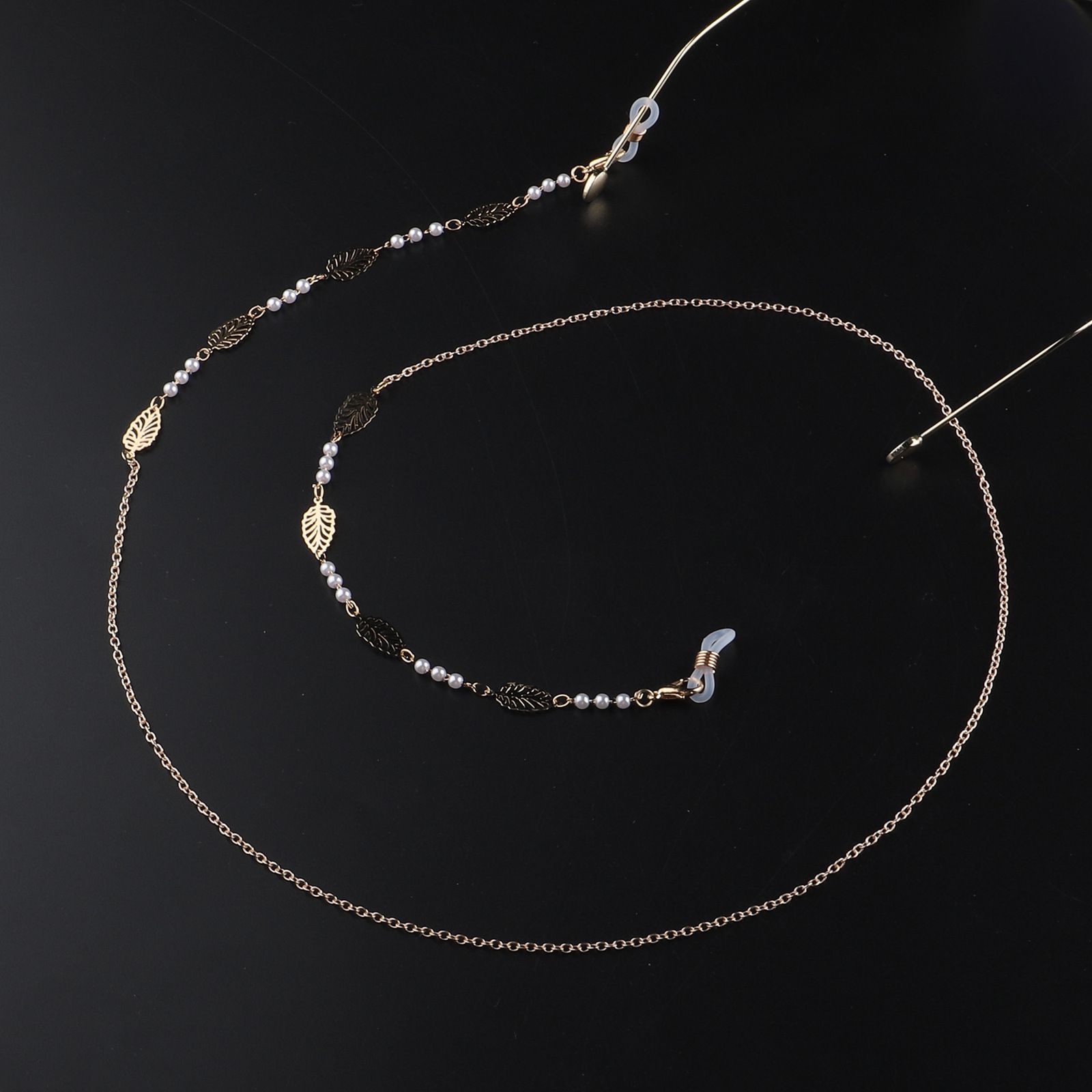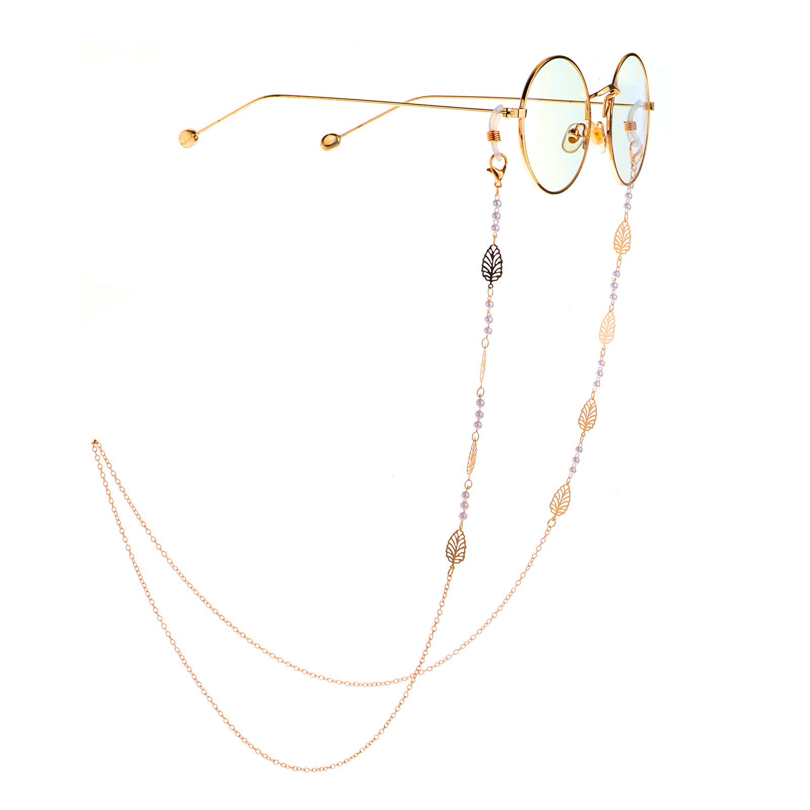 Gold-colored metal non-slip chain, with hollow leaves and pearl, for glasses and masks GL948