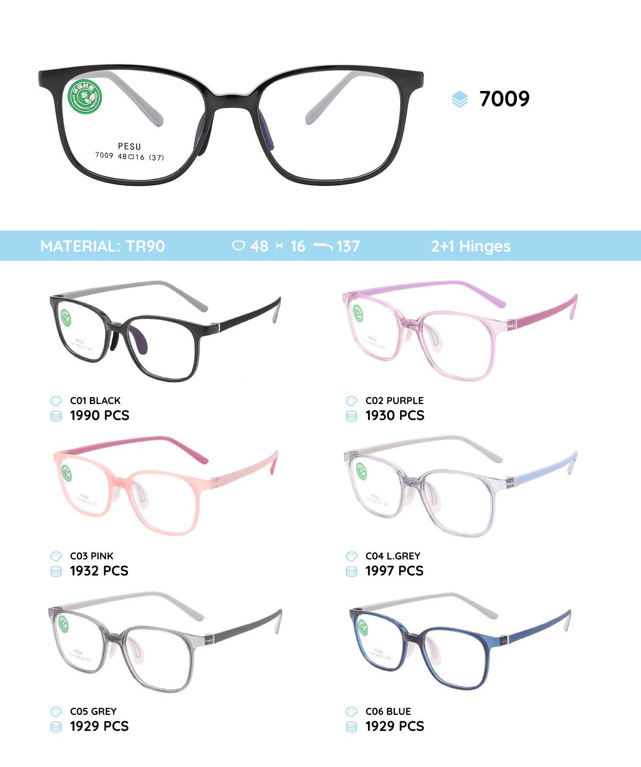 - Frame material: TR-90, metal
