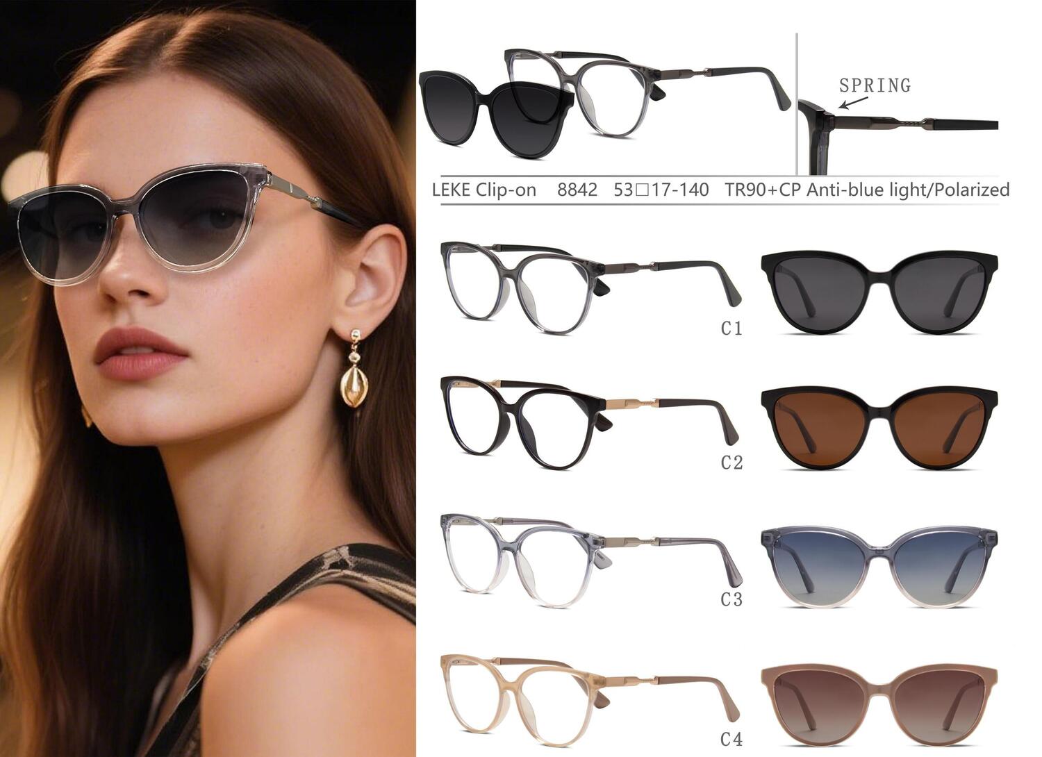 Plastic TR90+CP eyeglasses frame with blue ray cut protection, with spring hinges + sun protection polarized clip-on Leke LK8842