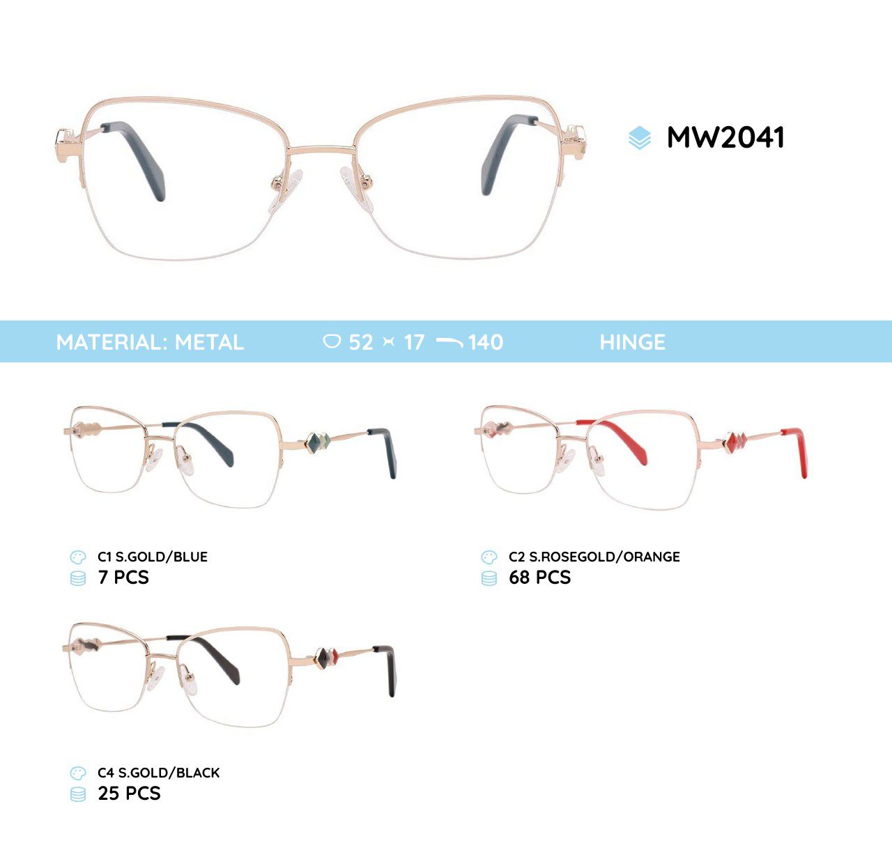 Metal frames for glasses. The material is stainless steel. The frames keep their shape well, at the same time they are flexible. High quality. Frames have good tactile properties and resistant to damage, they are lightweight and hypoallergenic. Many of models are decorated with rhinestones, have elegant temples and flex hinges. Fashionable design. This frames collection of high quality, passes piece control. In our store goods of this category have a low price for wholesale. European Conformity.