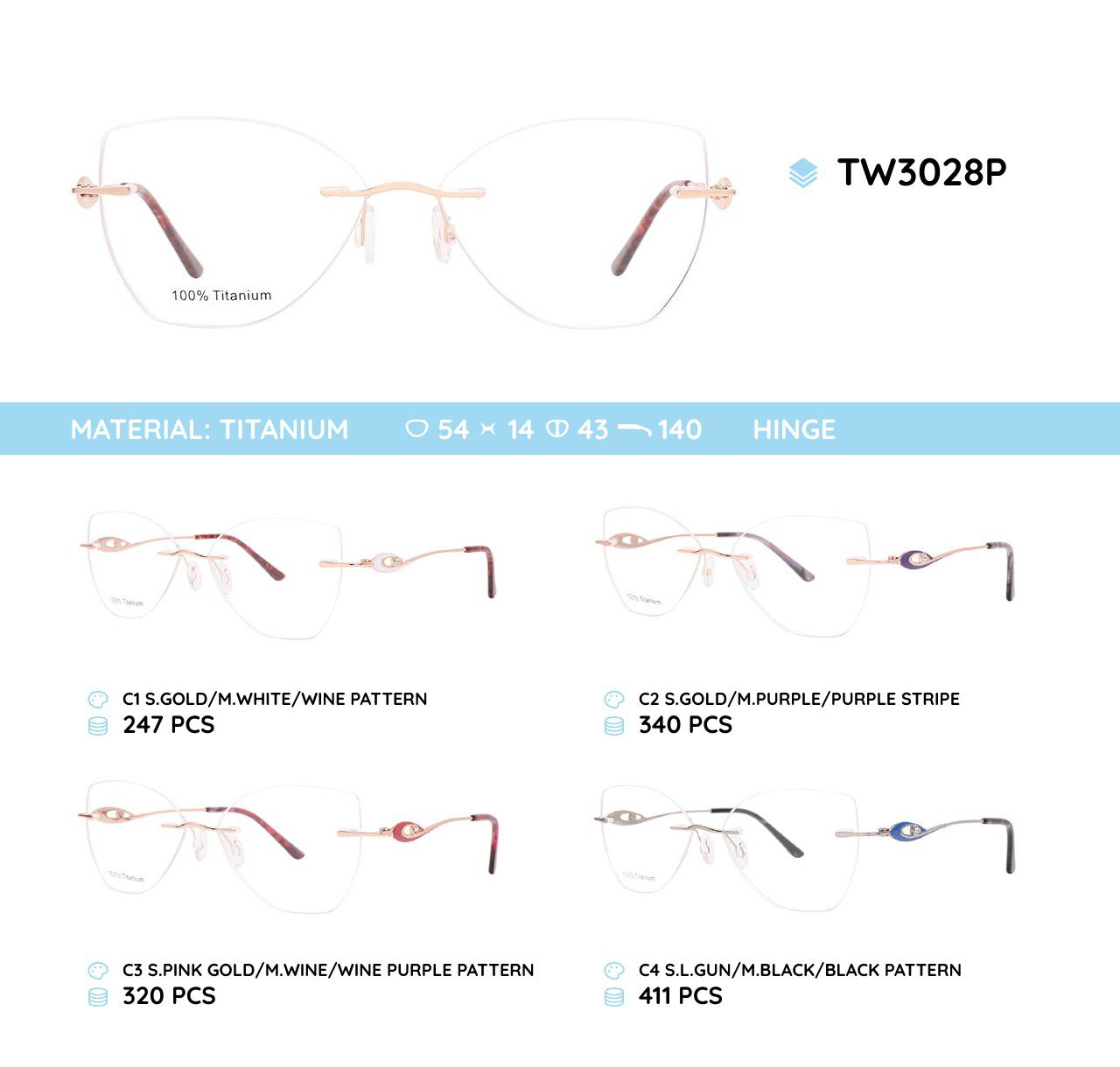 Metal frames for glasses. The material is titanium. The frames keep their shape well, at the same time they are flexible. High quality. Frames have good tactile properties and resistant to damage, they are lightweight and hypoallergenic. Many of models are decorated with rhinestones, have elegant temples and flex hinges. Fashionable design. This frames collection of high quality, passes piece control. In our store goods of this category have a low price for wholesale. European Conformity.