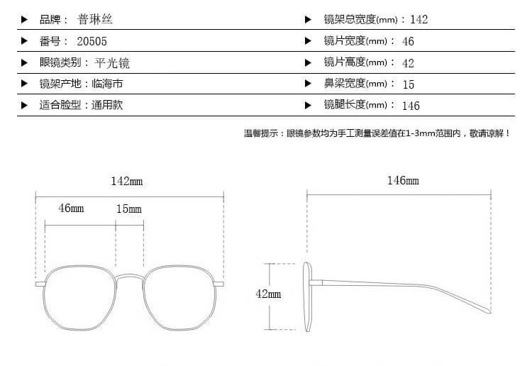 - Size: lens width - 46 mm, bridge - 15 mm, temple - 146 mm, total width - 142 mm, lens height - 42 mm