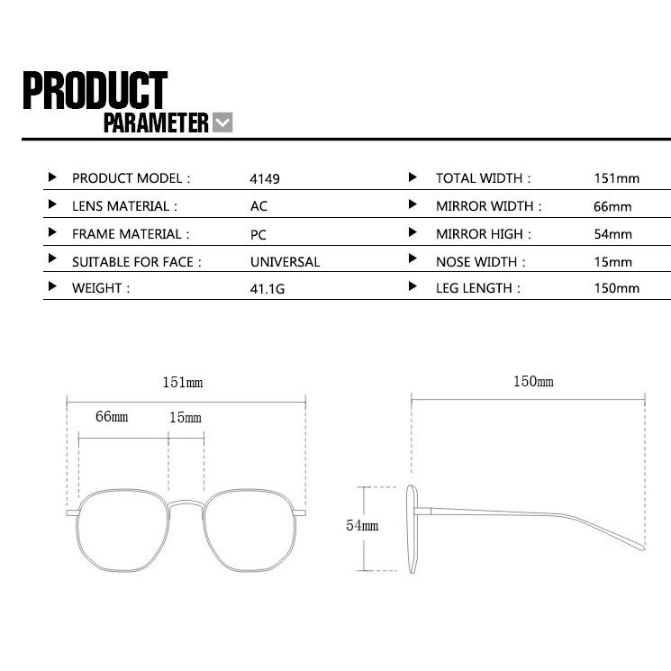 - Size: lens width - 66 mm, bridge - 15 mm, temple length - 150 mm