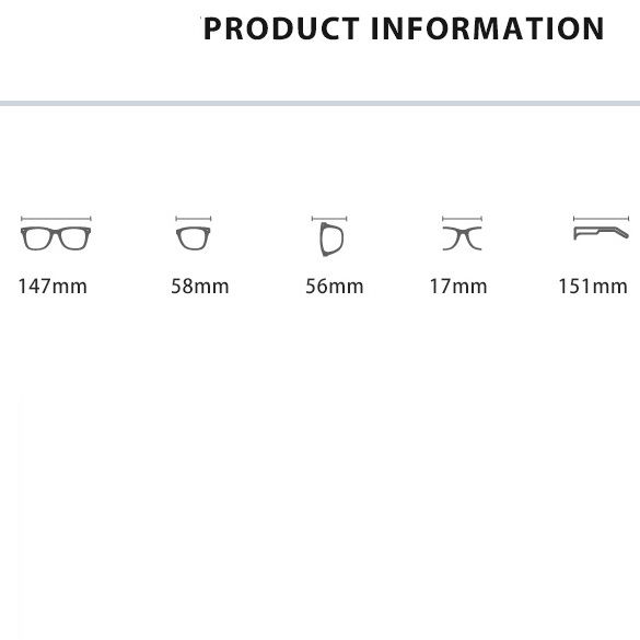 - Size: total width - 147 mm, lens width - 58 mm, lens height - 56 mm, bridge - 17 mm, temple length - 151 mm