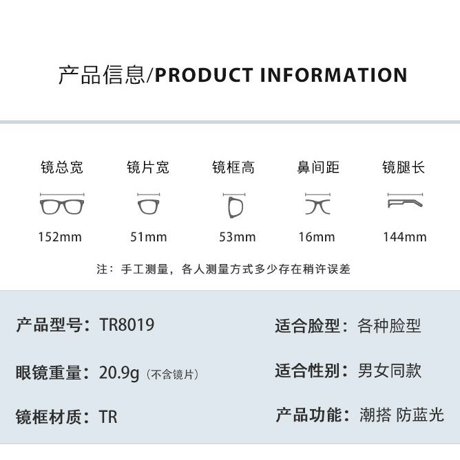- Size: total width - 152 mm, lens width - 51 mm, lens height - 53 mm, bridge - 16 mm, temple length - 144 mm