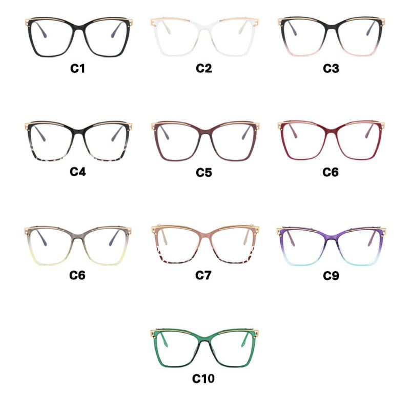 A collection of fashionable Blue Ray Cut eyeglass frames featuring a modern, minimalist style. These lightweight, comfortable, and durable frames are suitable for both blue light-blocking and vision correction lenses. The selection includes a variety of shapes: round, oval, rectangular, and a combination of both and a wide range of colors, from classic black and clear to vibrant shades. These frames complement any look, are suitable for everyday wear, work, and school, and thanks to high-quality materials, they provide durability and comfort.