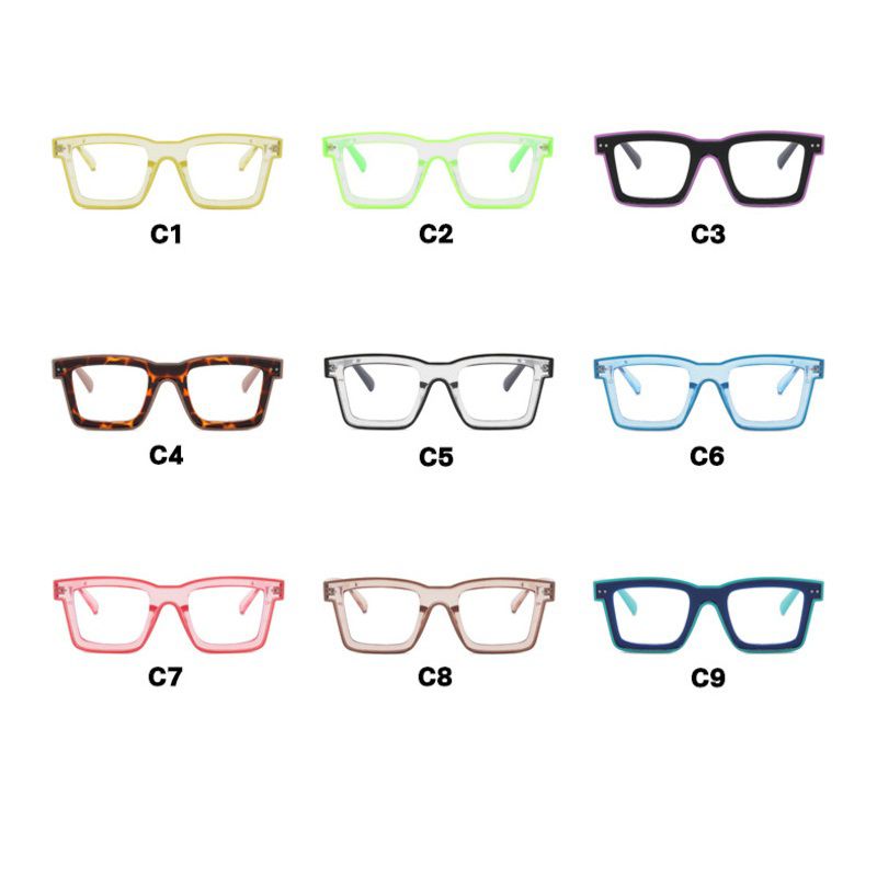 A collection of fashionable Blue Ray Cut eyeglass frames featuring a modern, minimalist style. These lightweight, comfortable, and durable frames are suitable for both blue light-blocking and vision correction lenses. The selection includes a variety of shapes: round, oval, rectangular, and a combination of both and a wide range of colors, from classic black and clear to vibrant shades. These frames complement any look, are suitable for everyday wear, work, and school, and thanks to high-quality materials, they provide durability and comfort.