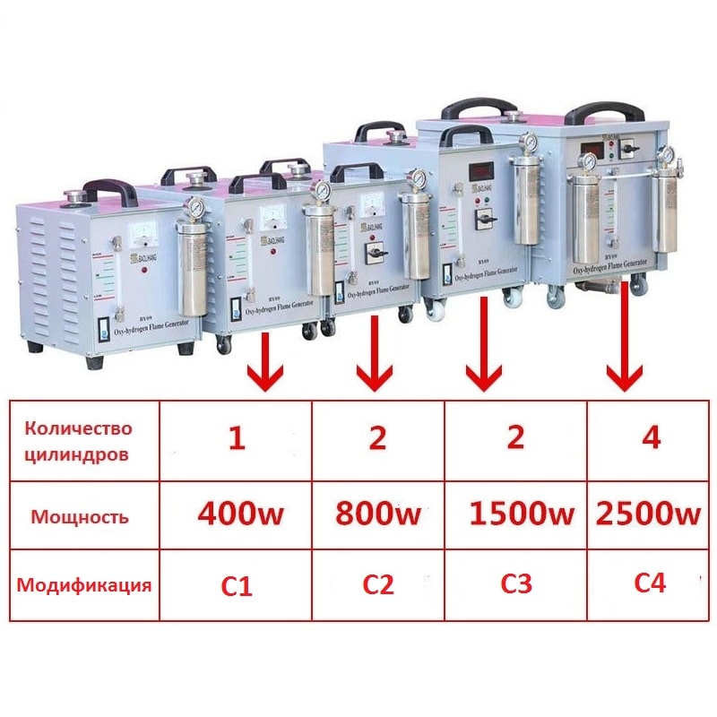 - C2 - Power: 800 W. Gas output: about 250 l/h. Size: 47x27x39 cm. Weight: 35 kg.