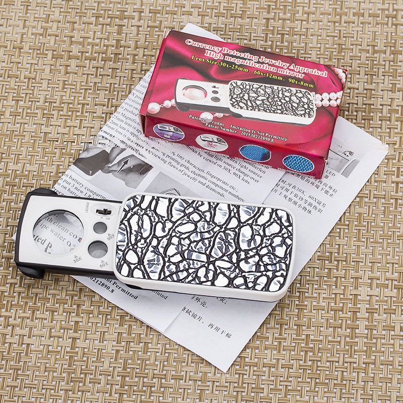 Лупа складная с универсальной подсветкой 774-3ZX-XX, размеры: ⌀25 мм, ⌀12 мм, ⌀8 мм. Увеличение: 30Х, 60Х, 90Х