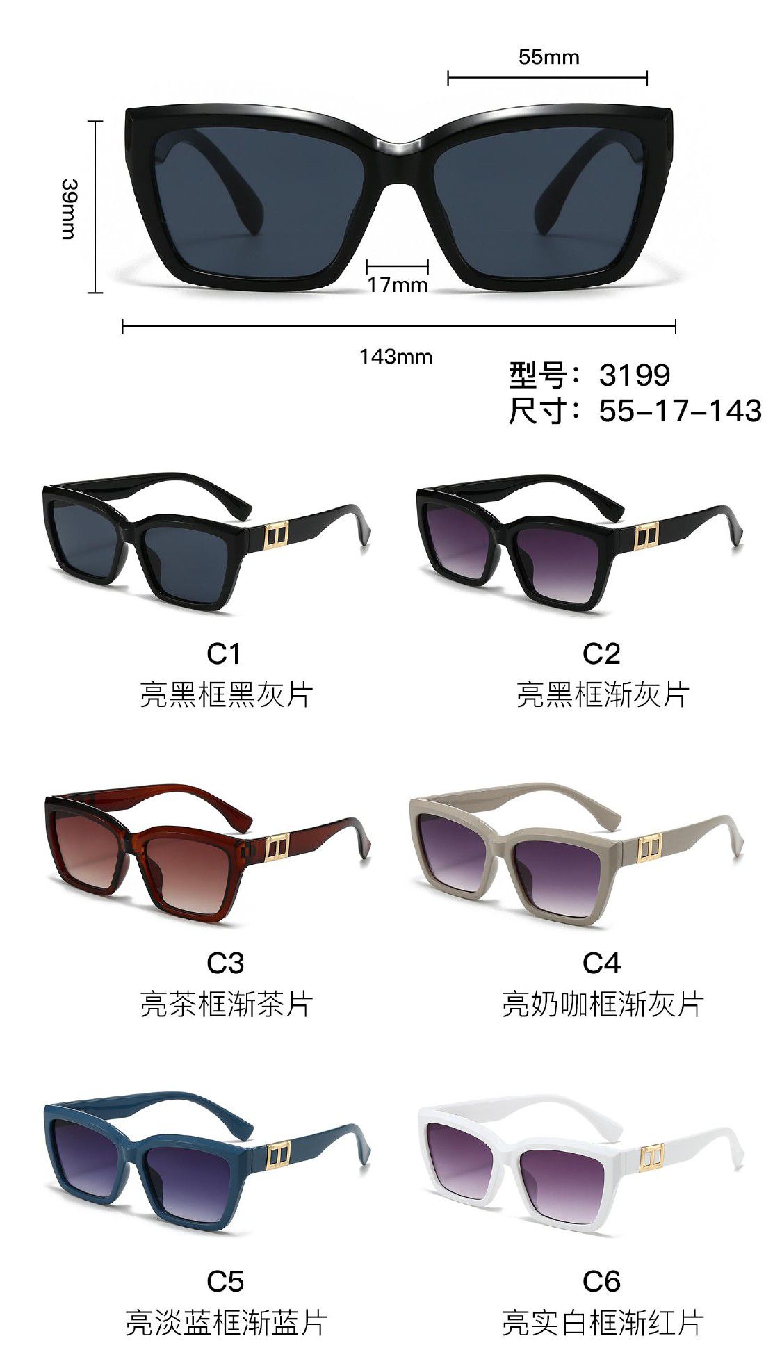 Солнцезащитные пластиковые очки из поликарбоната с пластиковым шарниром 3199W 3199W-W1 C6 - ¥ 6.00 В наличии
