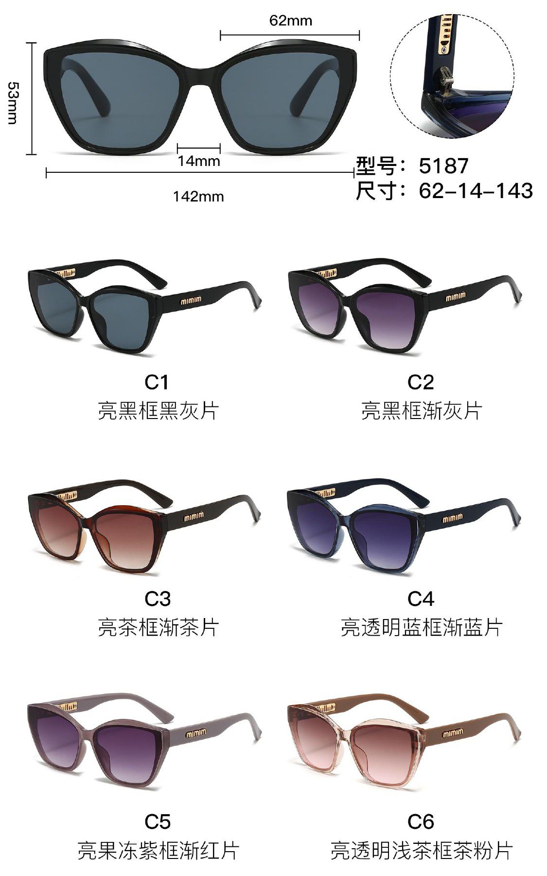 Солнцезащитные пластиковые очки из поликарбоната с металлическим шарниром 5187W