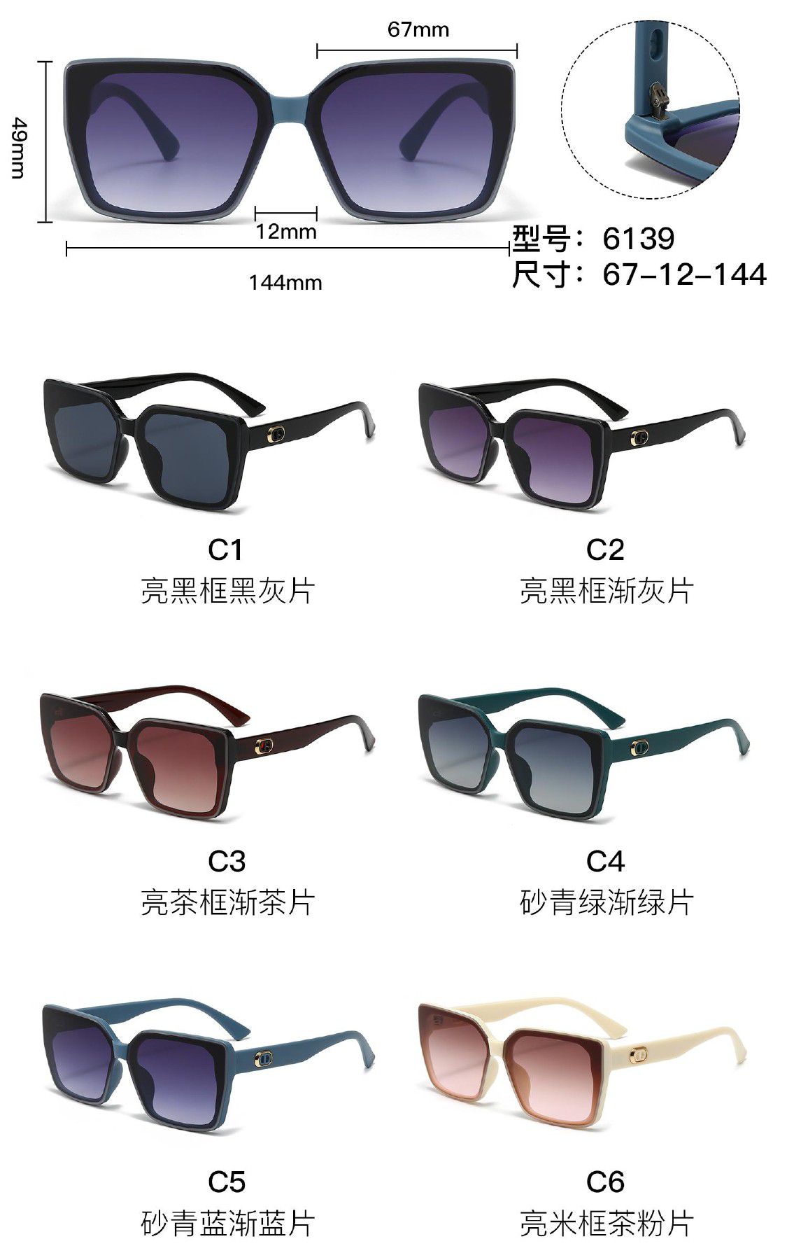 Солнцезащитные пластиковые очки из поликарбоната с металлическим шарниром 6139W