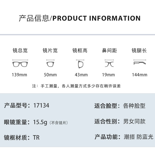 - Размер: общая ширина -139 мм, ширина линзы - 50 мм, высота линзы - 43 мм, мост - 19 мм, длина заушника - 144 мм