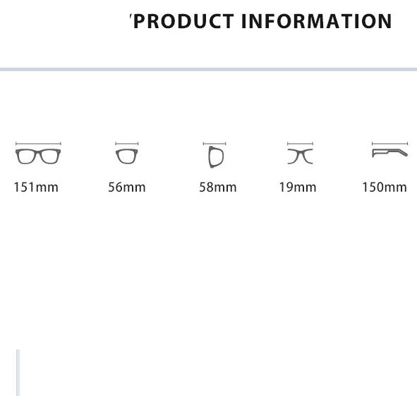 - Размер: общая ширина -151 мм, ширина линзы - 56 мм, высота линзы - 58 мм, мост - 19 мм, длина заушника - 150 мм