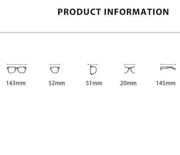 • Размер: общая ширина -143 мм, ширина линзы - 52 мм, высота линзы - 51 мм, мост - 20 мм, длина заушника - 145 мм