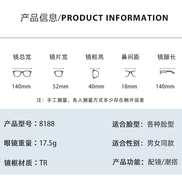 - Размер: общая ширина -140 мм, ширина линзы - 52 мм, высота линзы - 40 мм, мост - 18 мм, длина заушника - 140 мм
