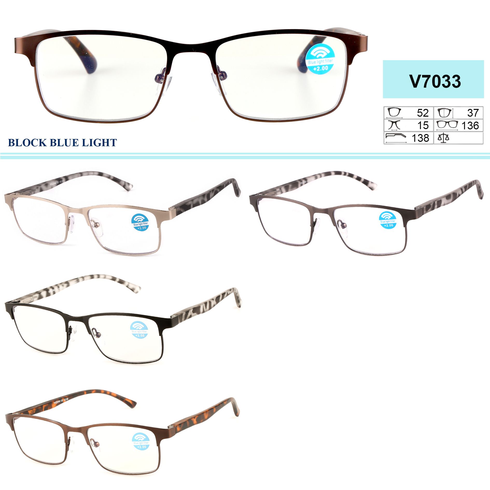 Очки с защитой от синего света в металлической оправе с флексом Vizzini V7033, диоптрии от +0.75 до +5.00 (шаг 0.25)