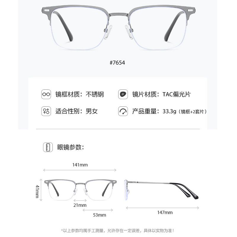 Оправа металлическая с защитой от синего света + 2 магнитные солнцезащитные насадки (клипон) 7654-GT