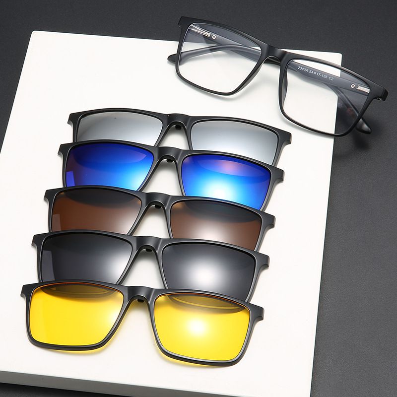 - Комплект: оправа пластиковая + 5 солнцезащитных насадок + кожаная сумка