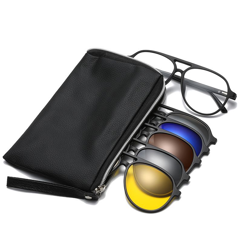 - Комплект: оправа пластиковая + 5 солнцезащитных насадок + кожаная сумка
