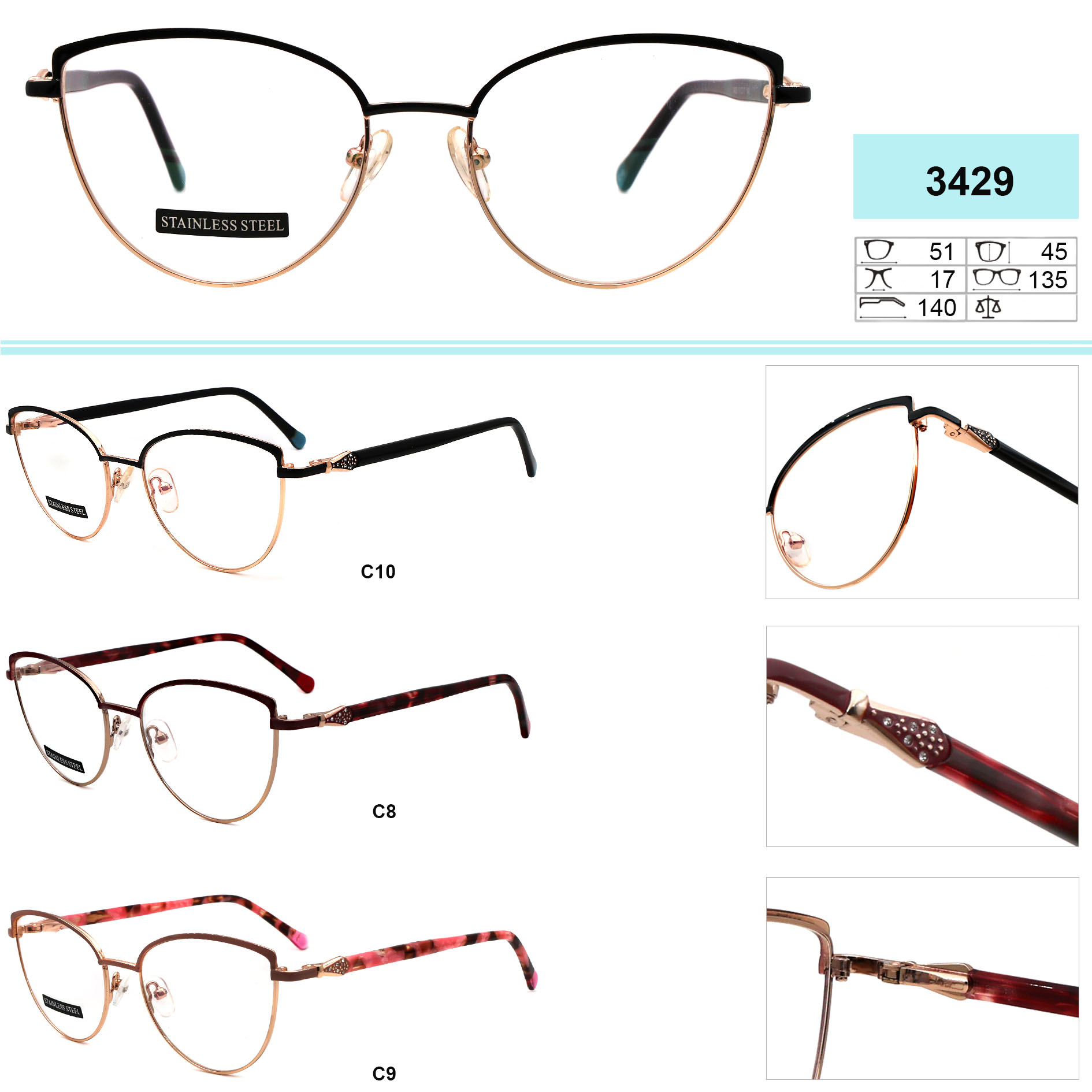 Оправы для очков металлические. Материал сталь (Stainless steel). Оправы хорошо держат свою форму, в тоже время эластичны в работе при изготовлении очков, высокого качества, имеет приятные тактильные свойства, устойчивы к повреждениям, легки, обладают гипоаллергенными свойствами. Многие модели декорированы стразами, с элегантными заушниками и флексами (flex). Модный дизайн. Данная коллекция оправ высокого качества, проходит штучный контроль. В нашем магазине дана низкая цена на товар данной категории, для оптовой продажи. Стандарт CE (европейский стандарт качества)