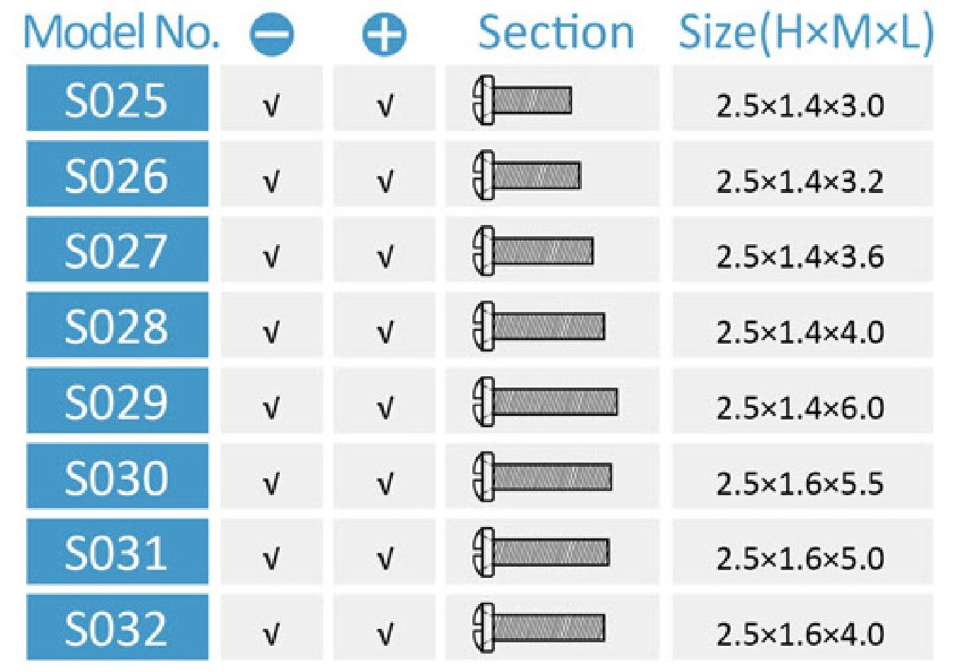 - S031 - 2.5*1.6*5.0 мм, шлицевой/крестовый
