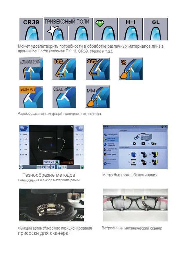 - Различные режимы обработки материала (обычная линза из смолы, линза с высоким индексом, жесткая линза, PC-линза);