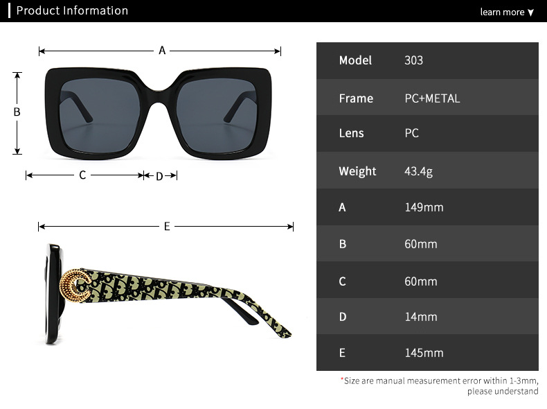 - Size: lens width - 60 mm, bridge distance - 14 mm, temple - 145 mm