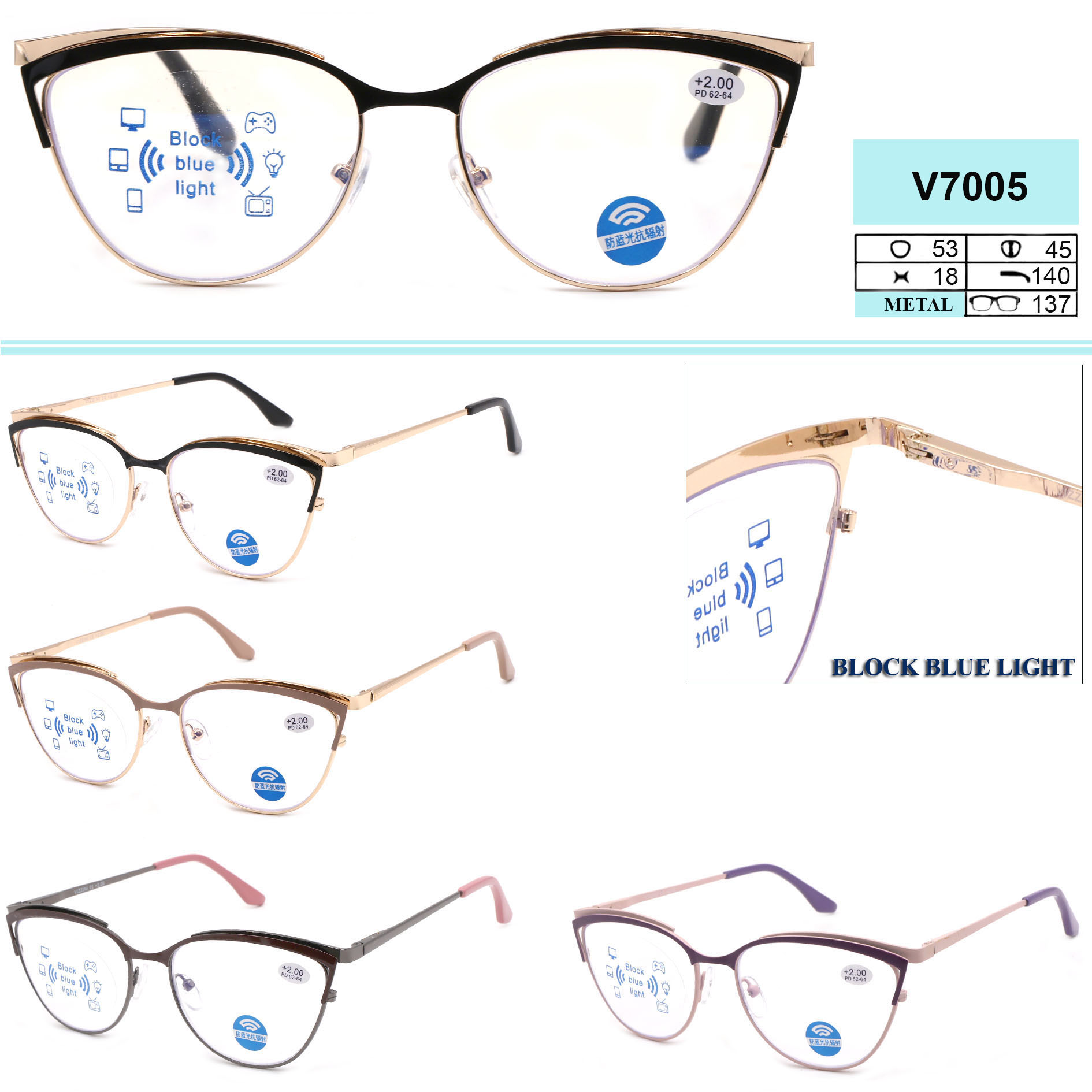 Women's metal eyeglasses with flex hinges Vizzini V7005 BLUE BLOCK LIGHT Diopters: +0.75 to +6.00 (step 0.25); -1.00 to -8.00 (step 0.25) V7005 blue block 防蓝光 mix 混 +1.0 ¥ 17.50 В наличии