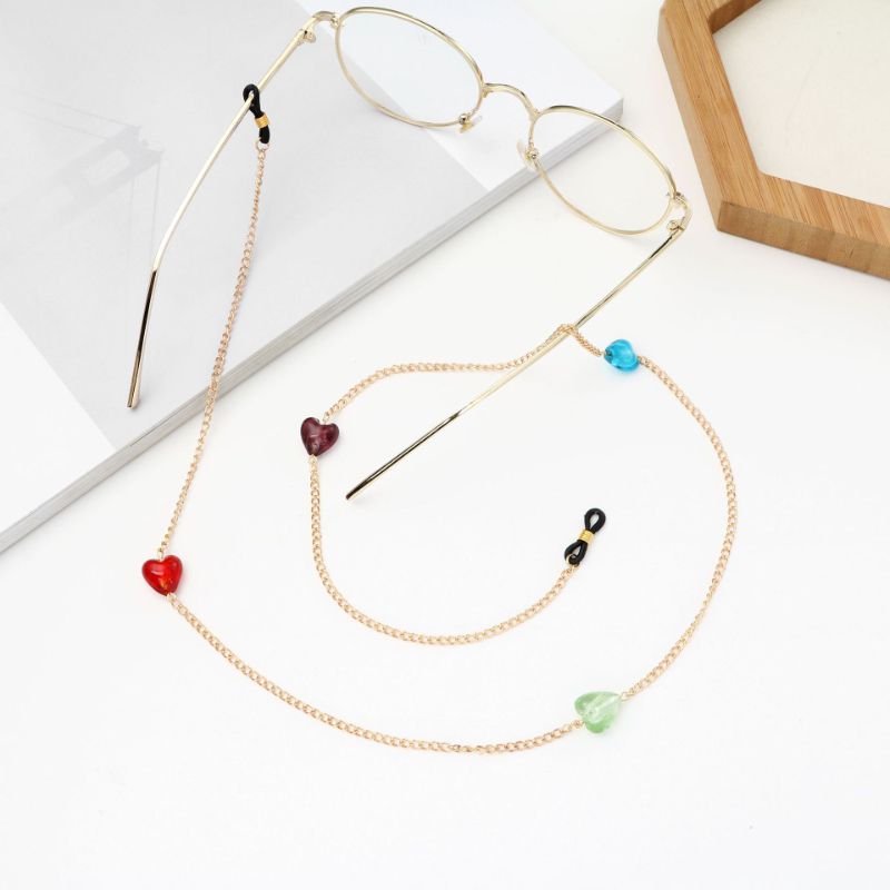Gold-colored metal non-slip chain, with colored glass beads in the shape of a heart, for glasses and masks GA050