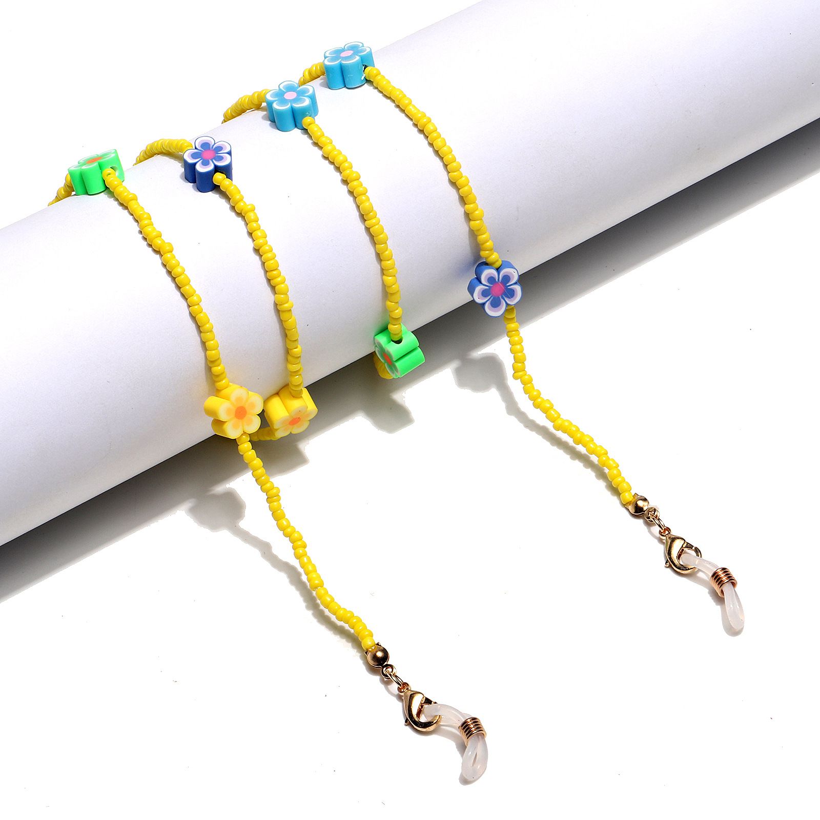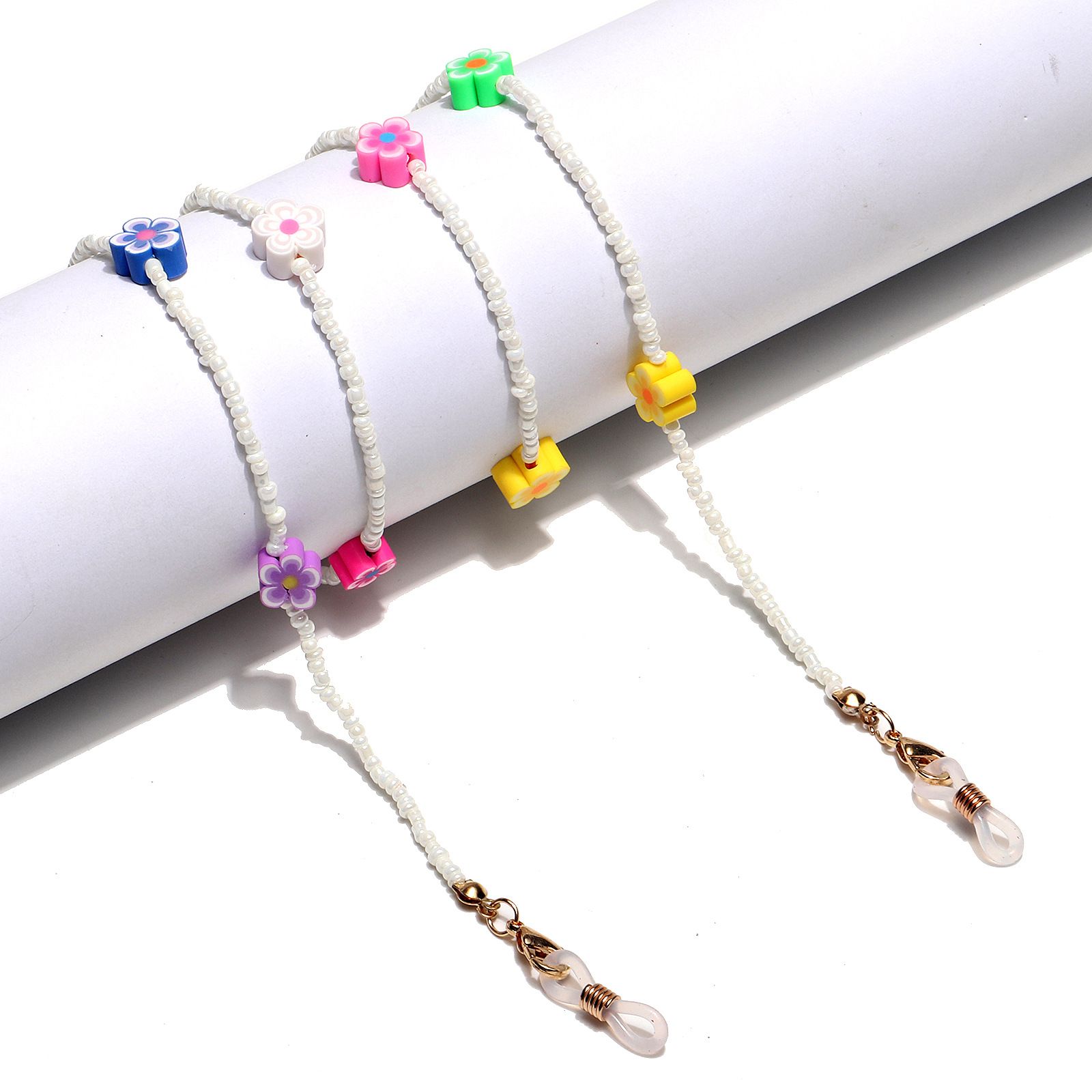 Gold-colored metal non-slip chain, with flowers and colorful rice beads, for glasses and masks GL1289-1