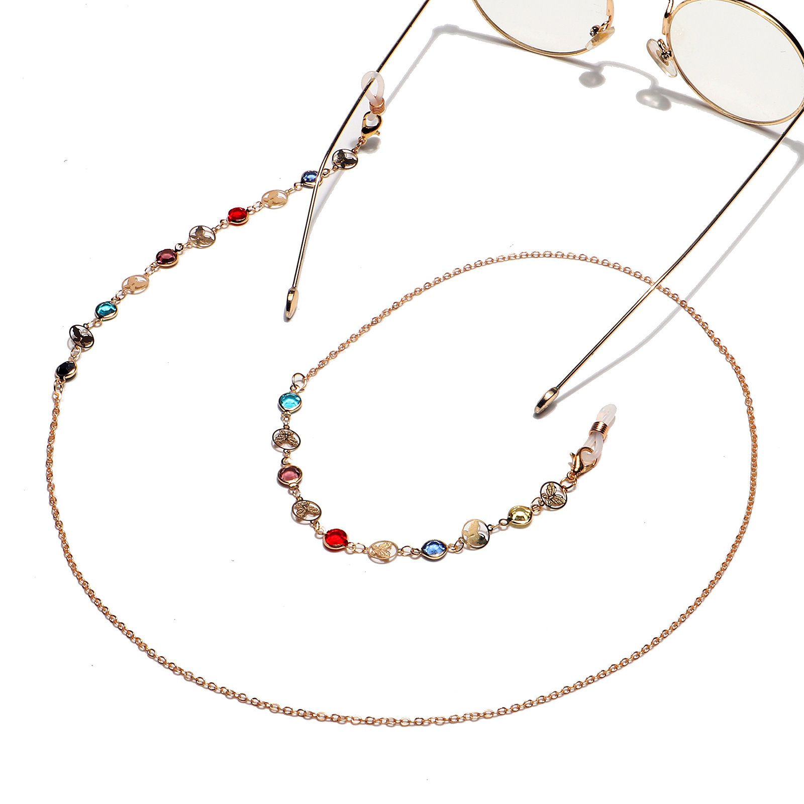 Gold-colored metal non-slip chain, with copper butterfly and colorful crystal, for glasses and masks GL1290