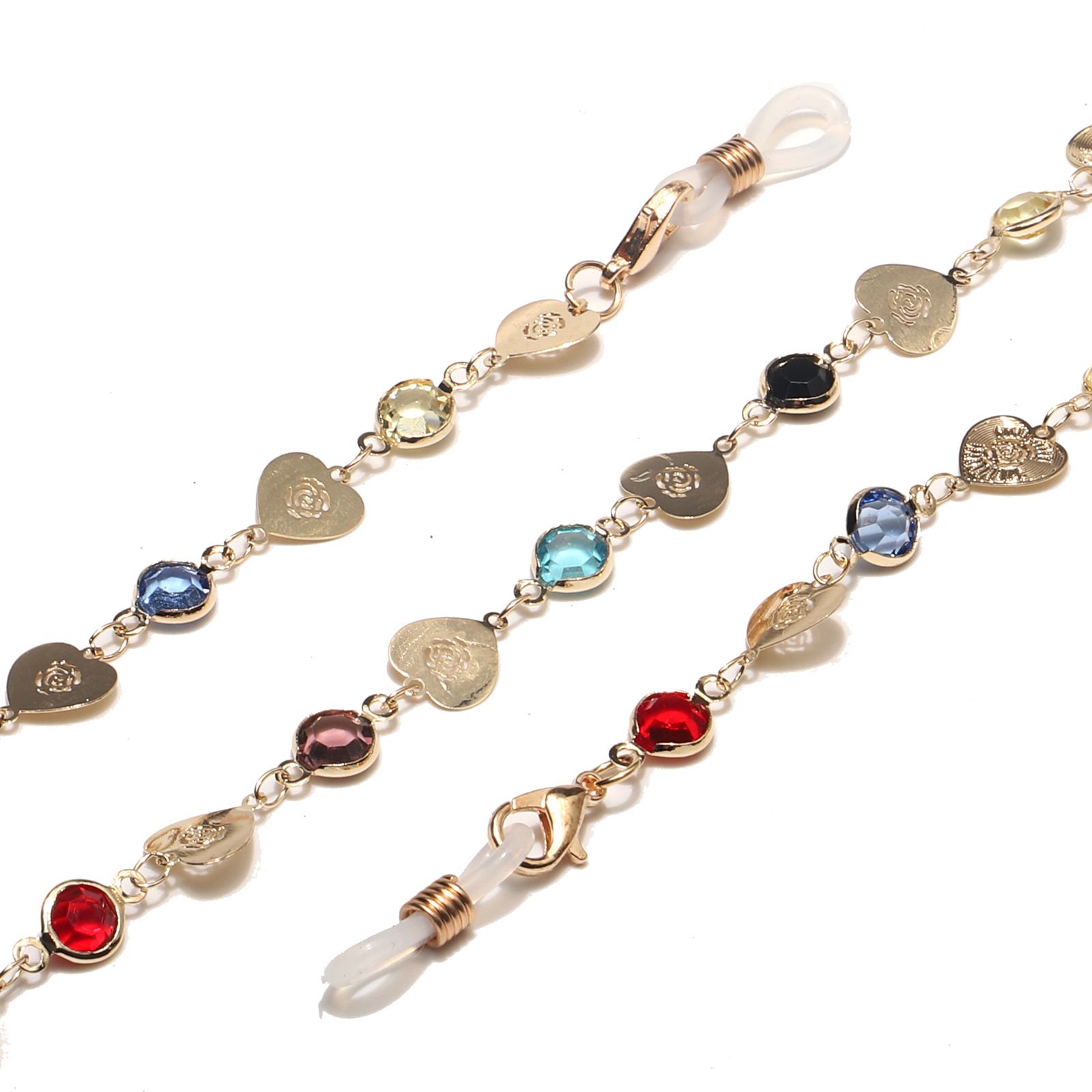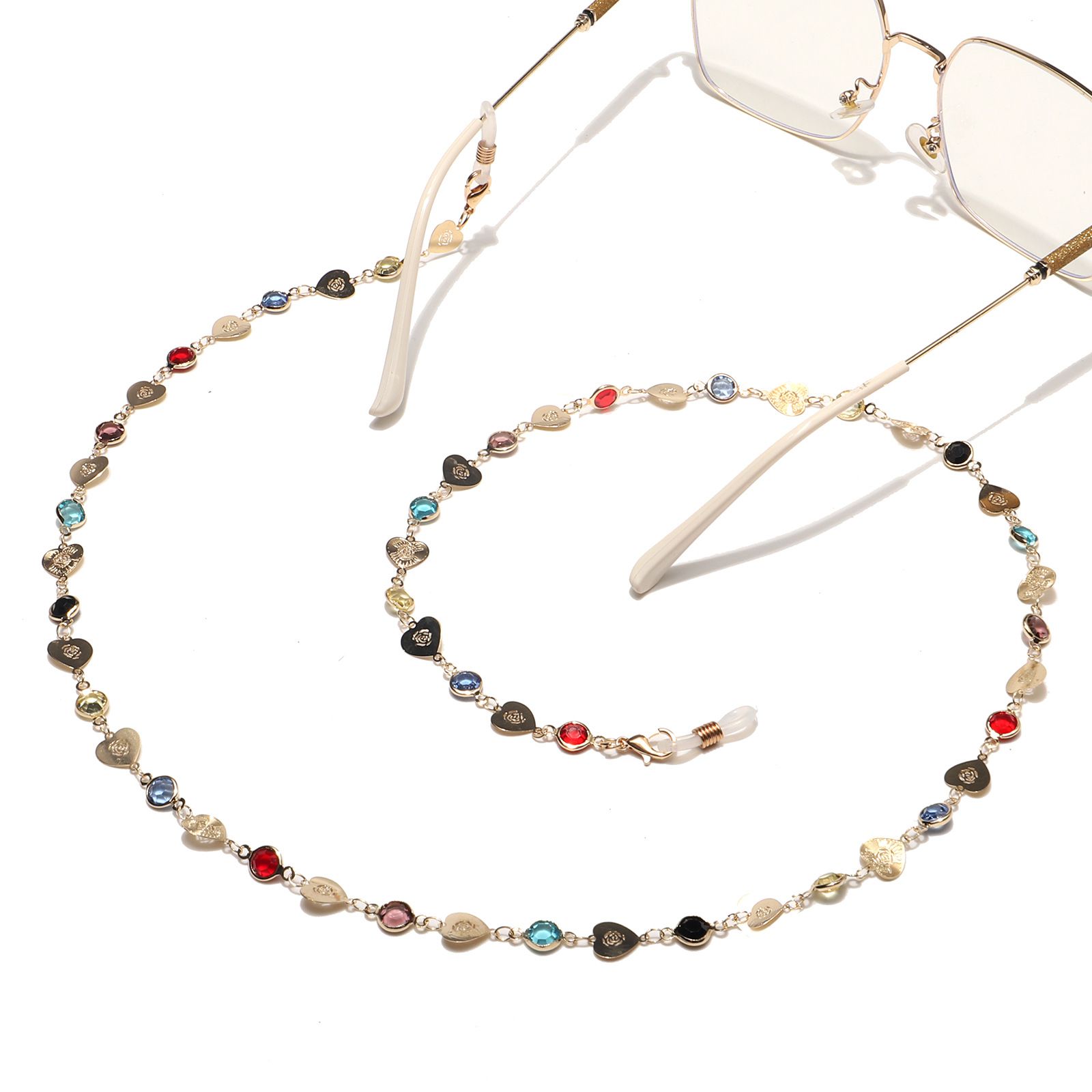 Gold-colored metal non-slip chain, with gold heart and colorful crystal, for glasses and masks GL1464