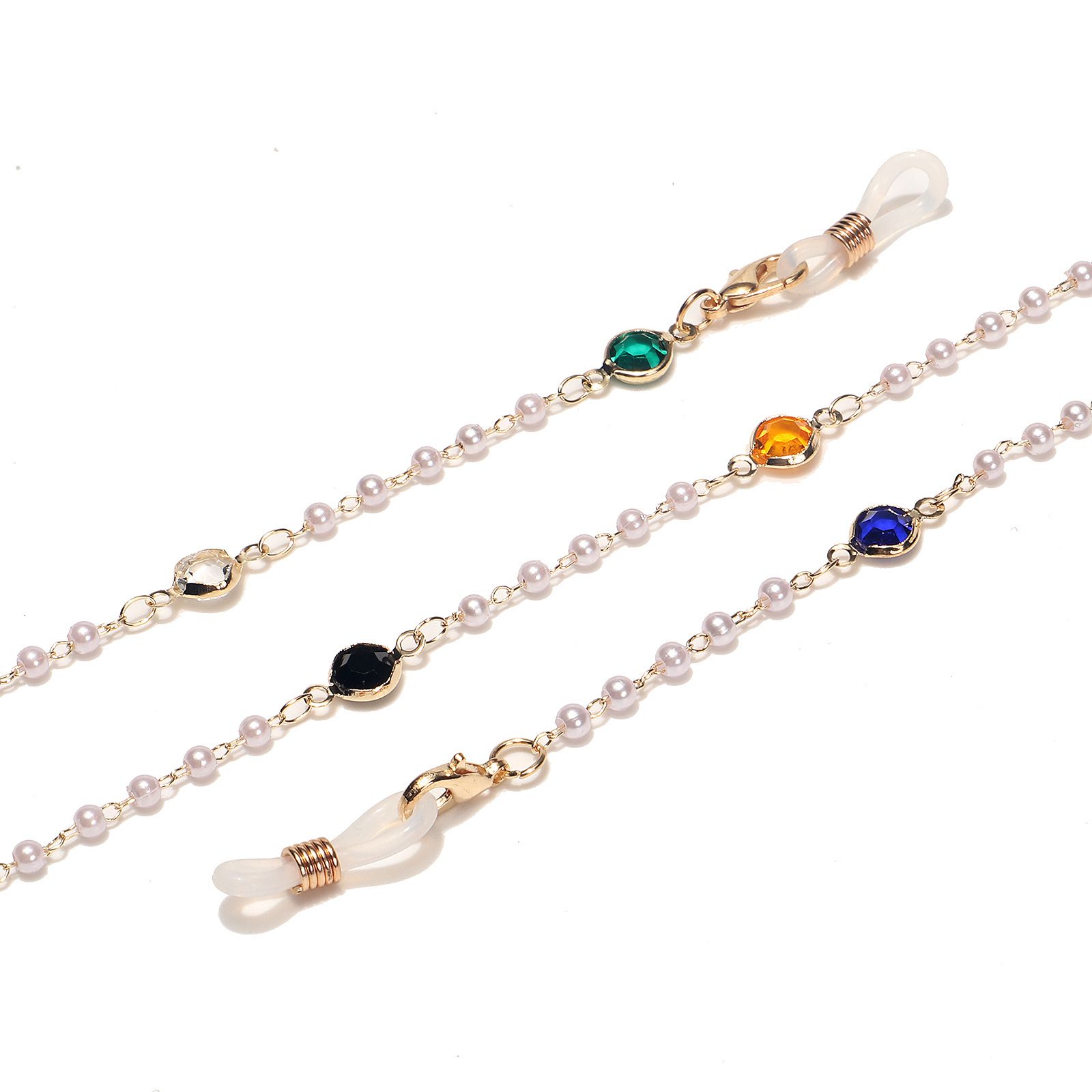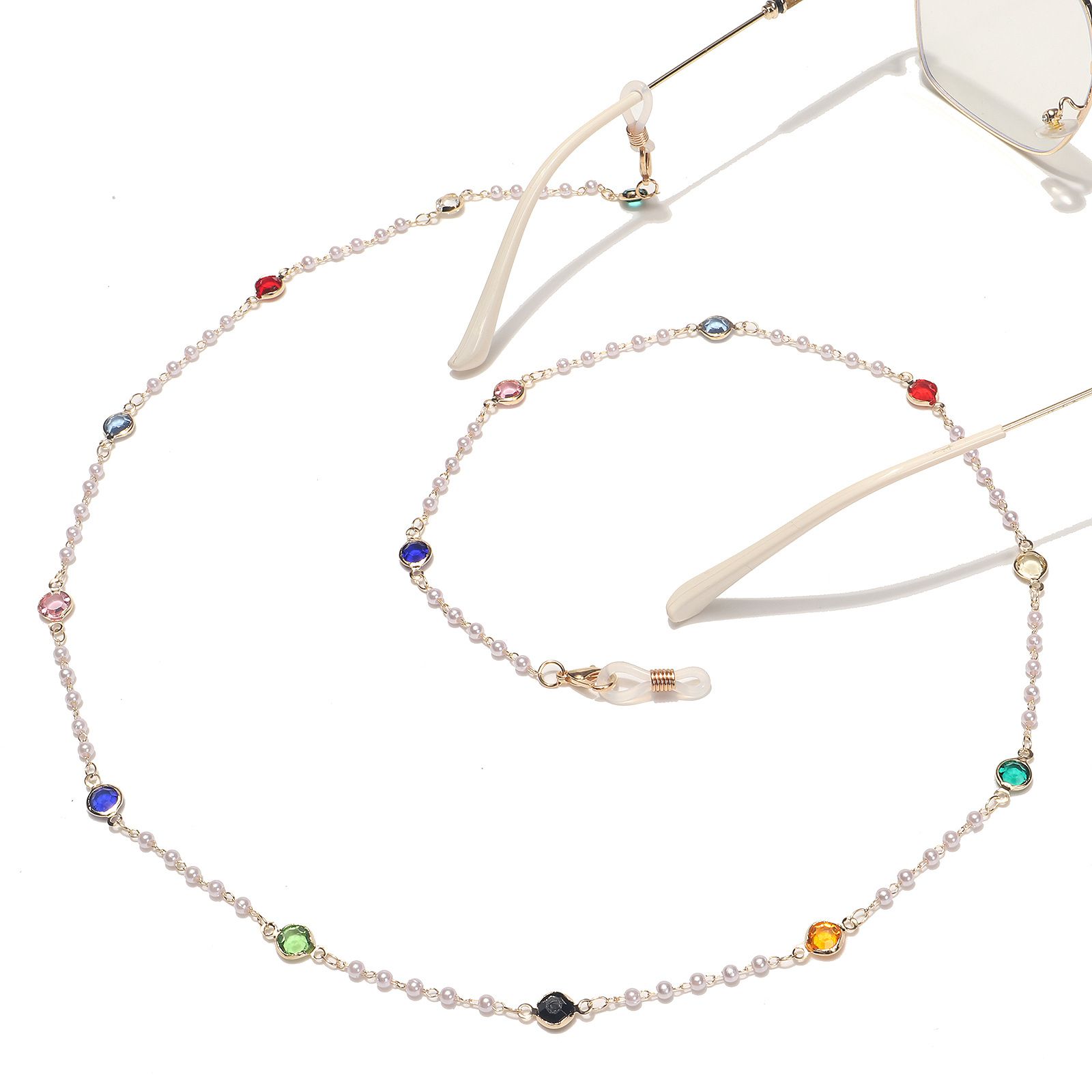 Gold-colored metal non-slip chain, with colored glass and pearl, for glasses and masks GL1542