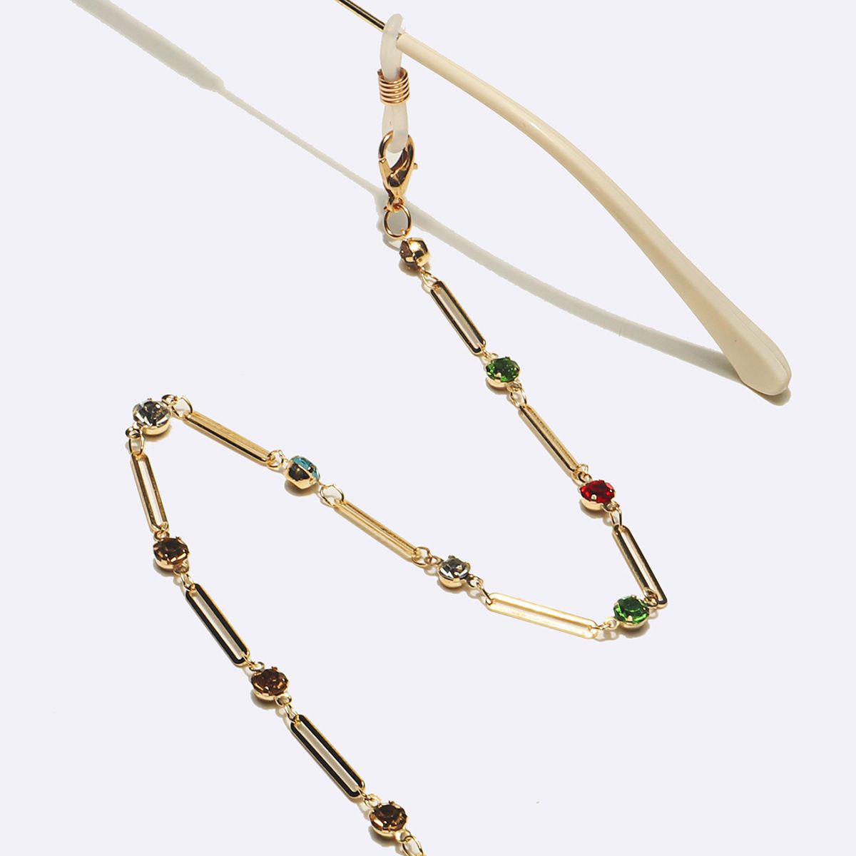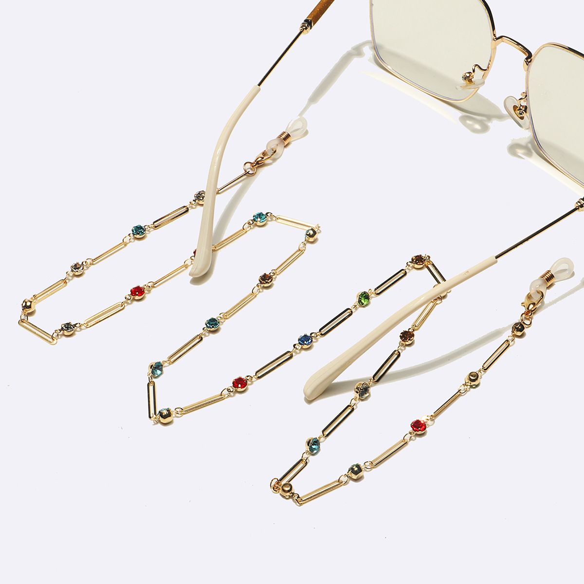 Gold-colored metal non-slip chain, with olval and colorful rhinestones, for glasses and masks GL1629