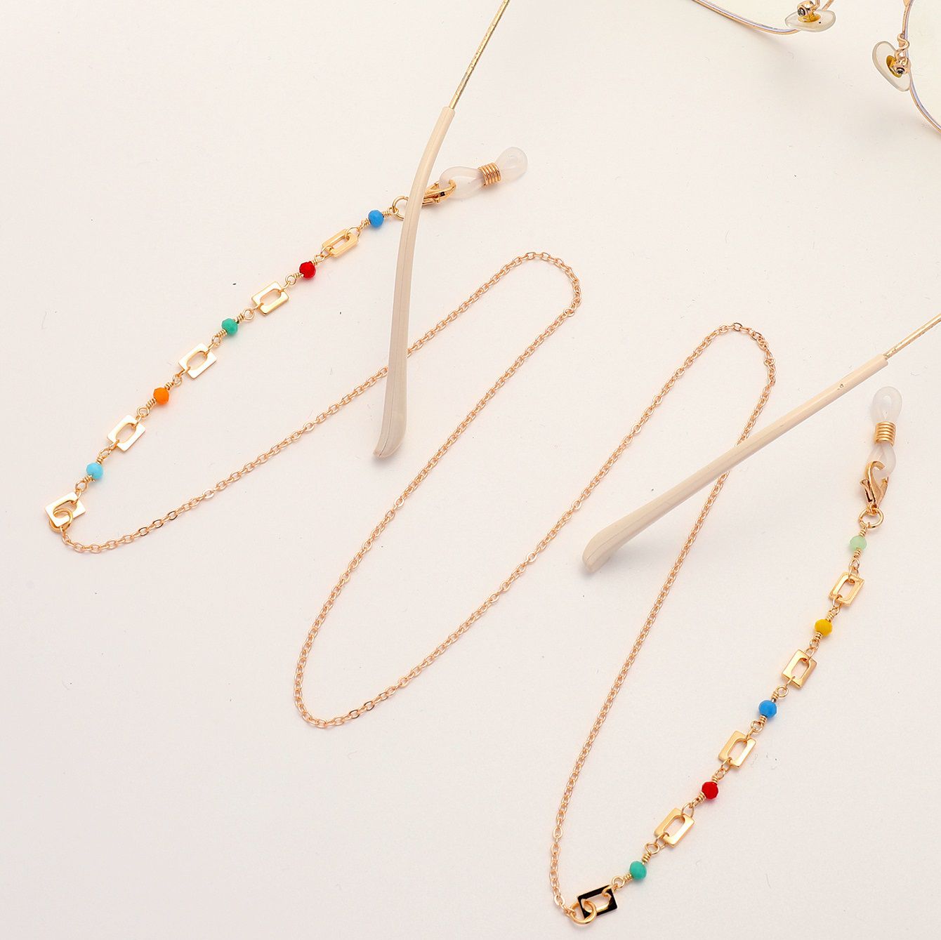 Gold-colored metal non-slip chain, with colored crystal and metal restangular, for glasses and masks GL1859