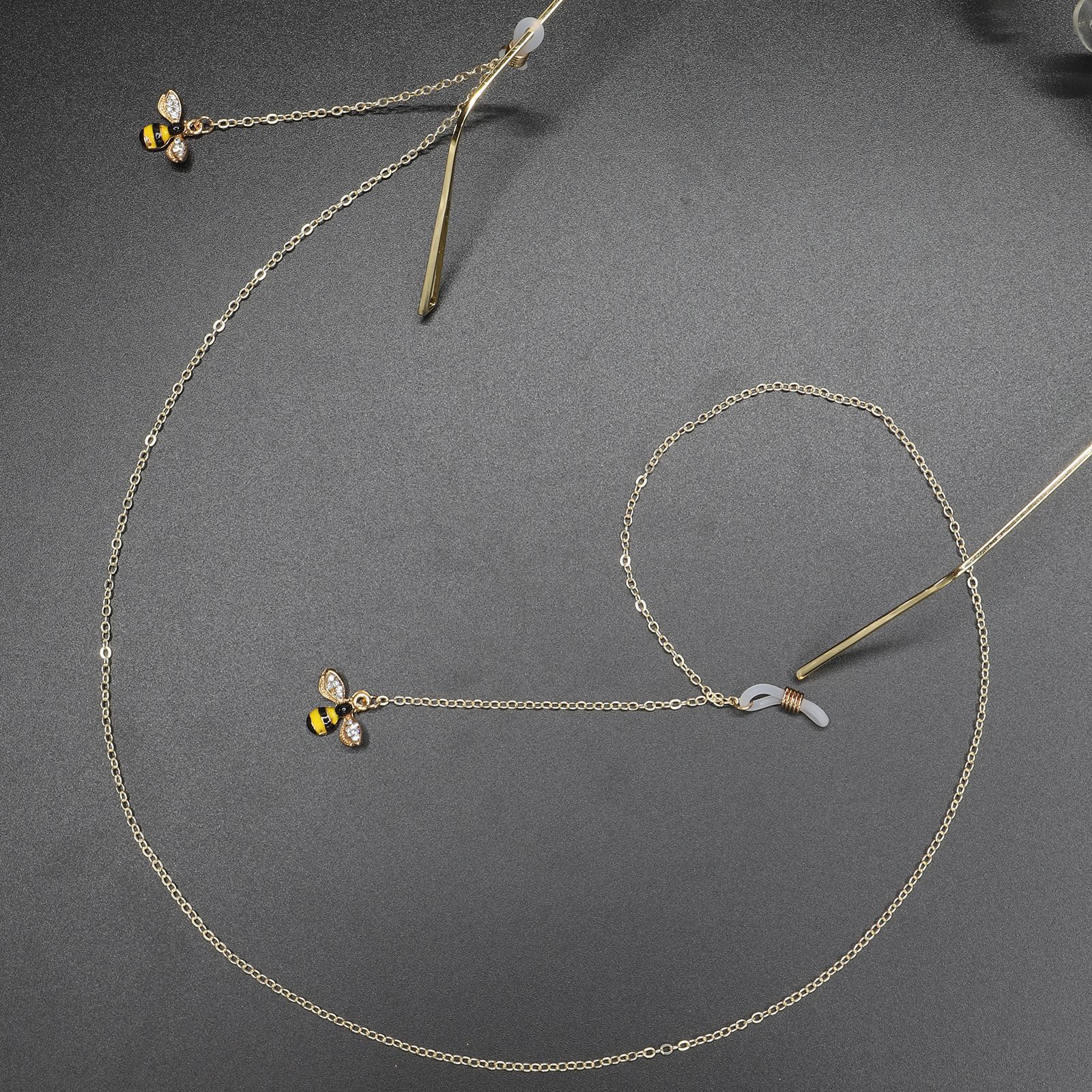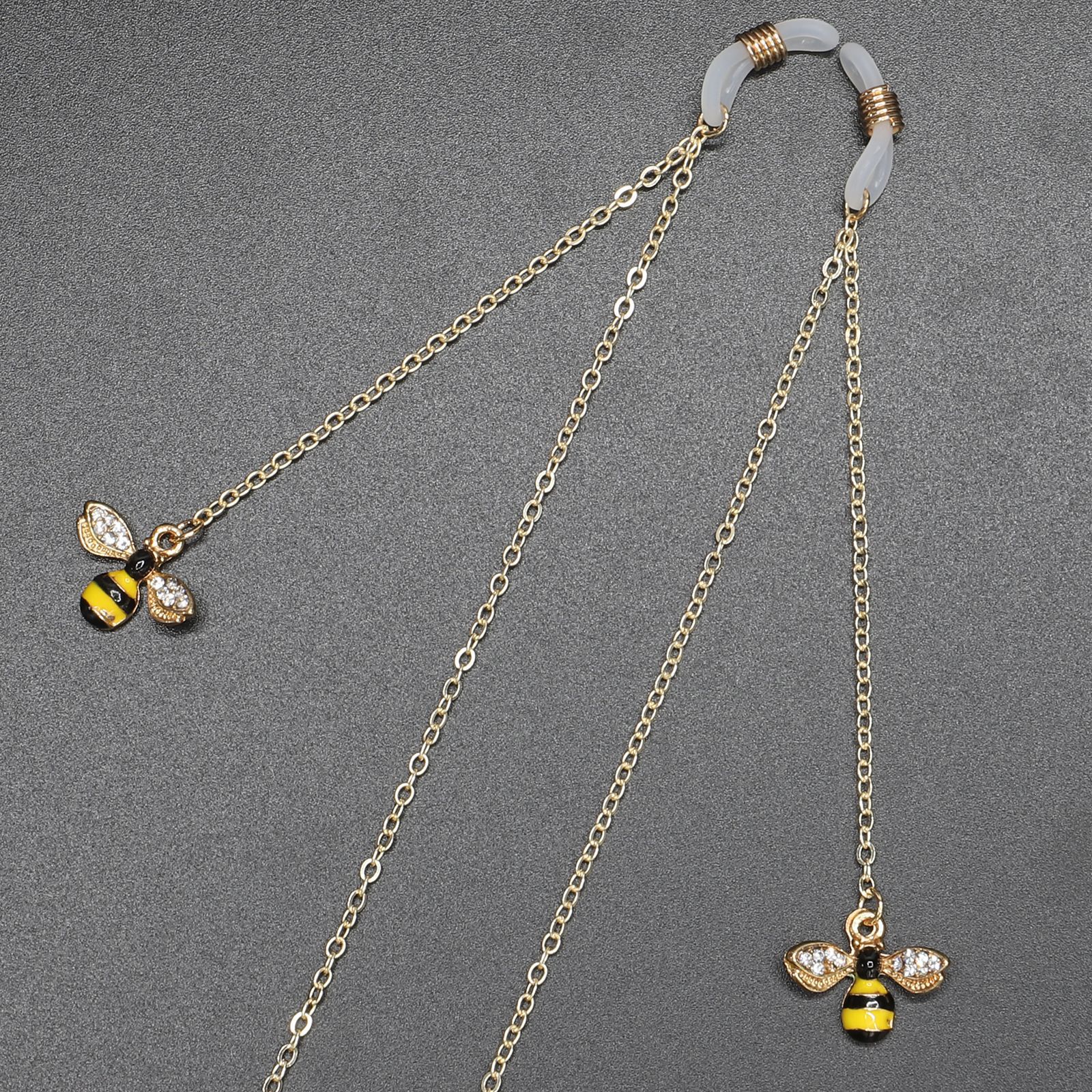 Gold-colored metal non-slip chain, with pendant bee with rhinestone, for glasses and masks GL373