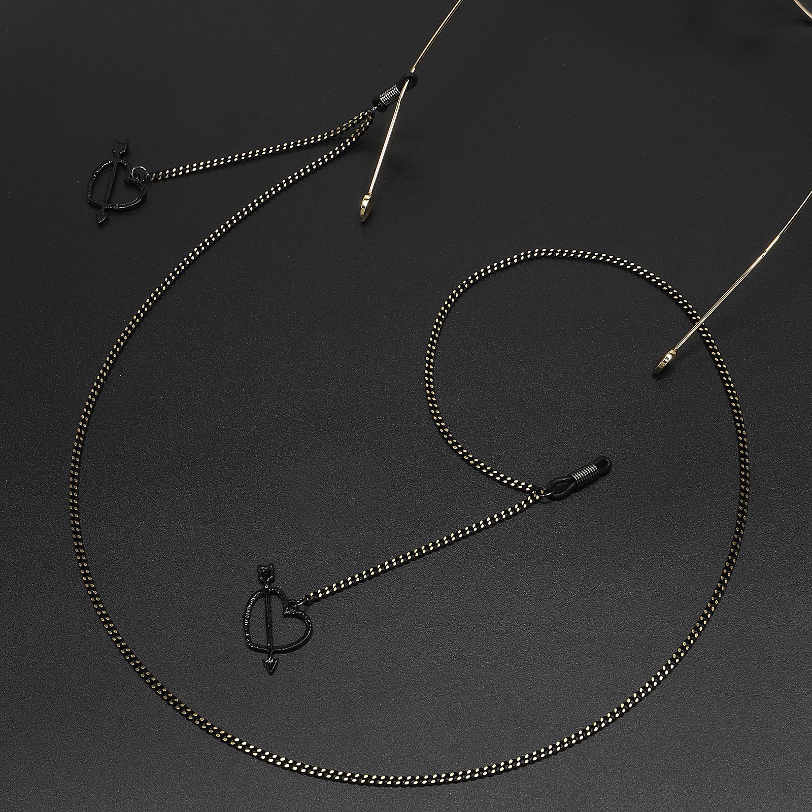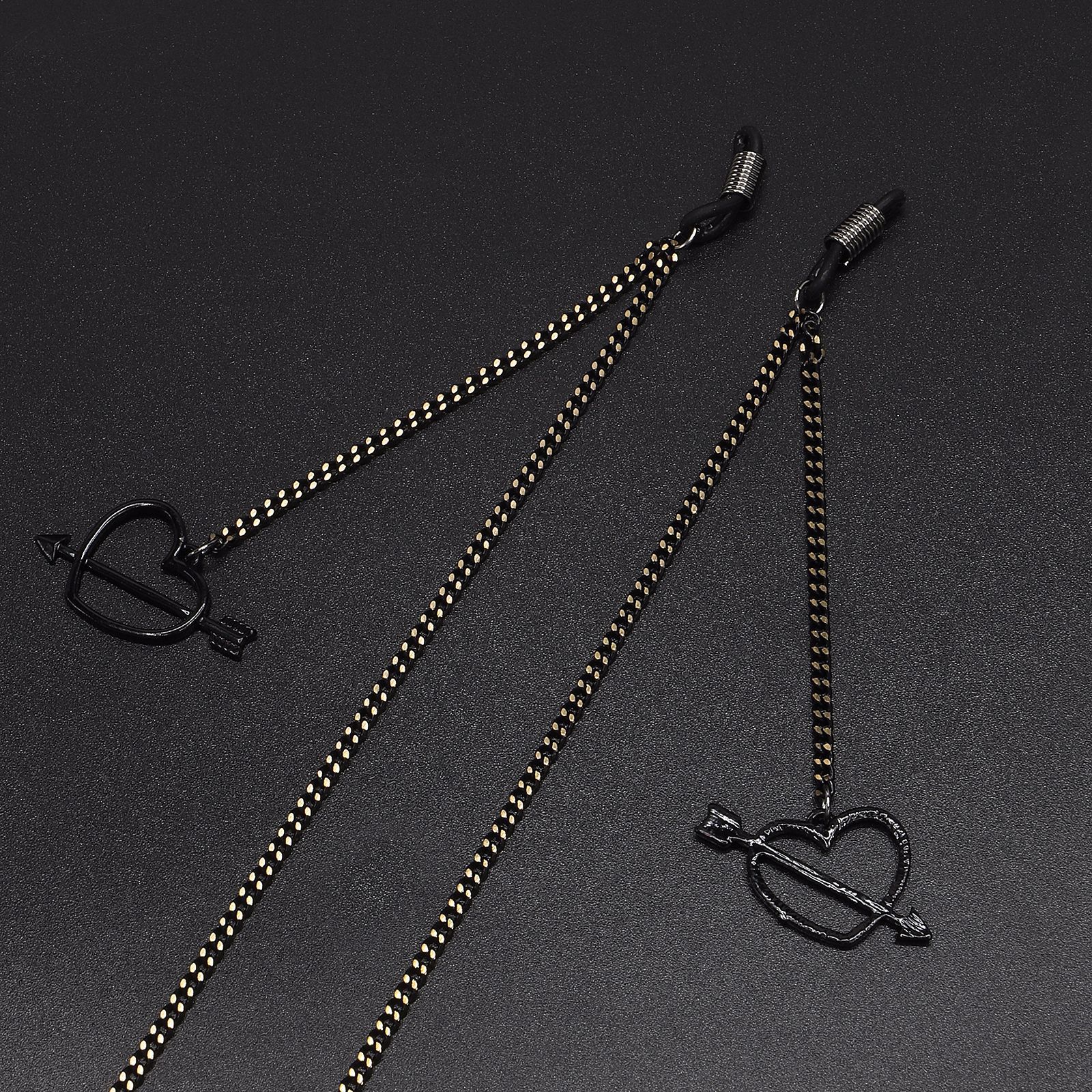 Black-colored metal non-slip chain, with pendant hollow heart-piercing, for glasses and masks GL543