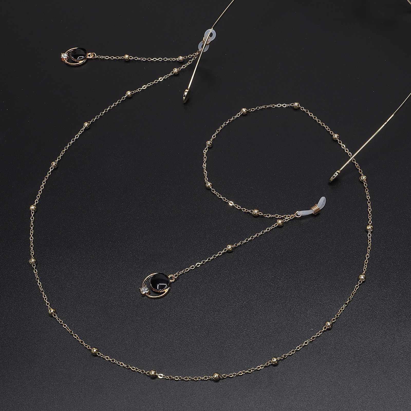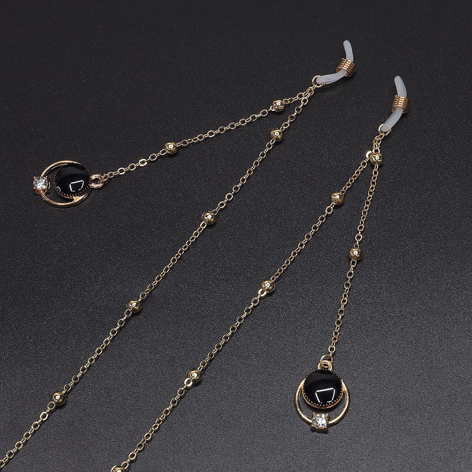 Gold-colored metal non-slip chain, with pendant black pearl and rhinestones, for glasses and masks GL579
