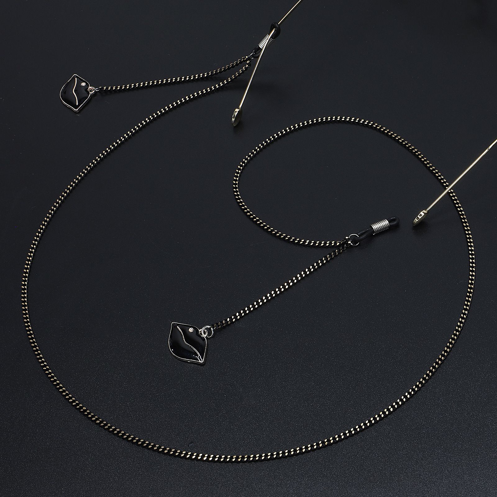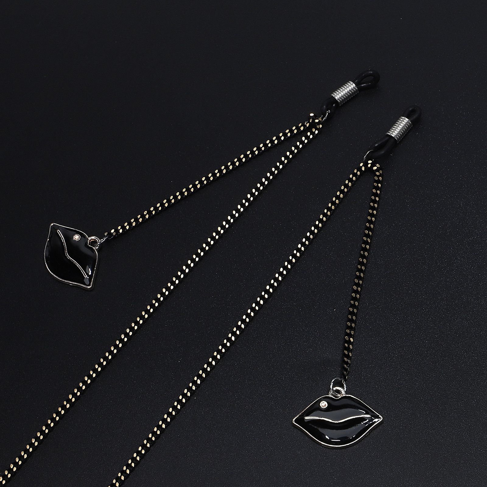 Black-colored metal non-slip chain, with pendant black lips, for glasses and masks GL595