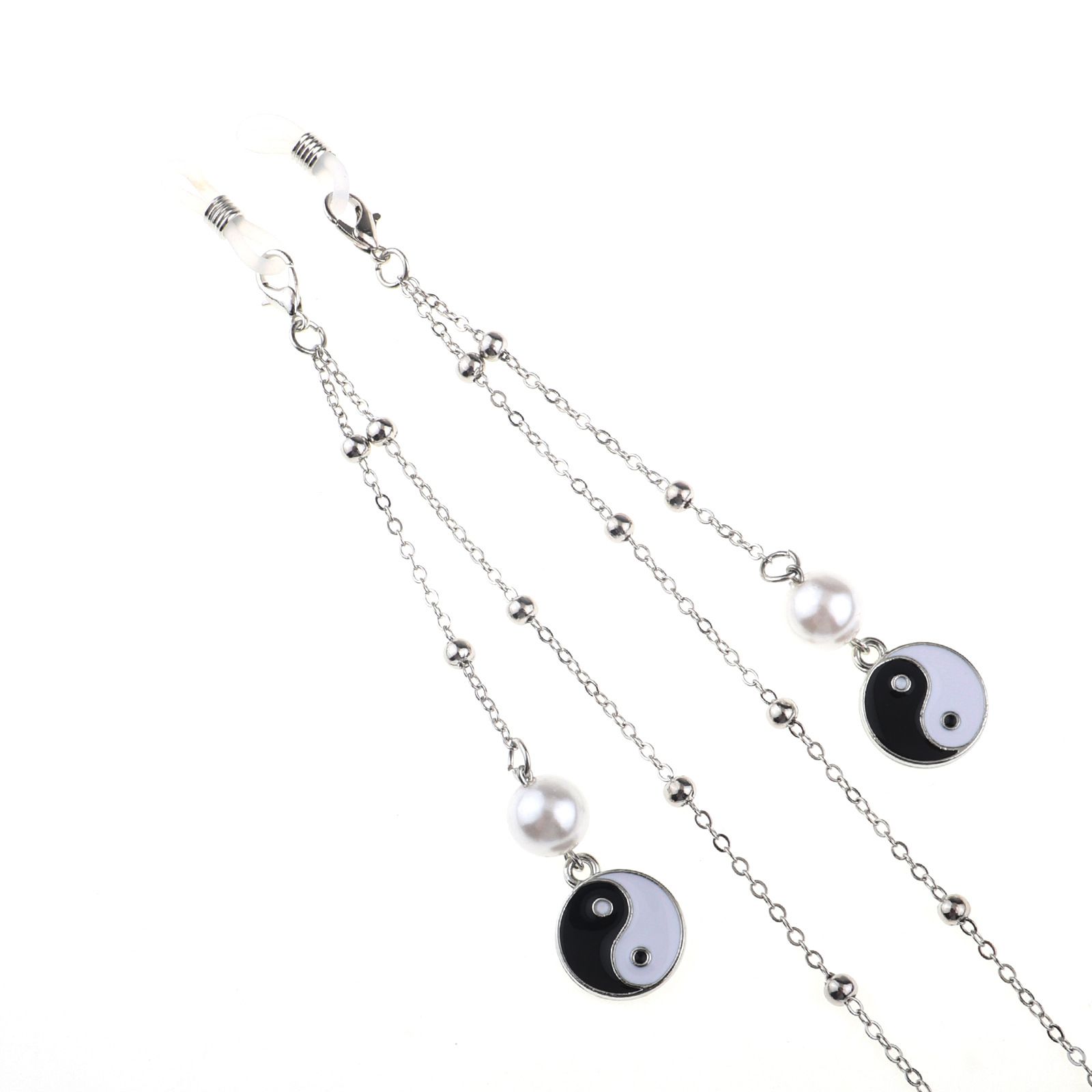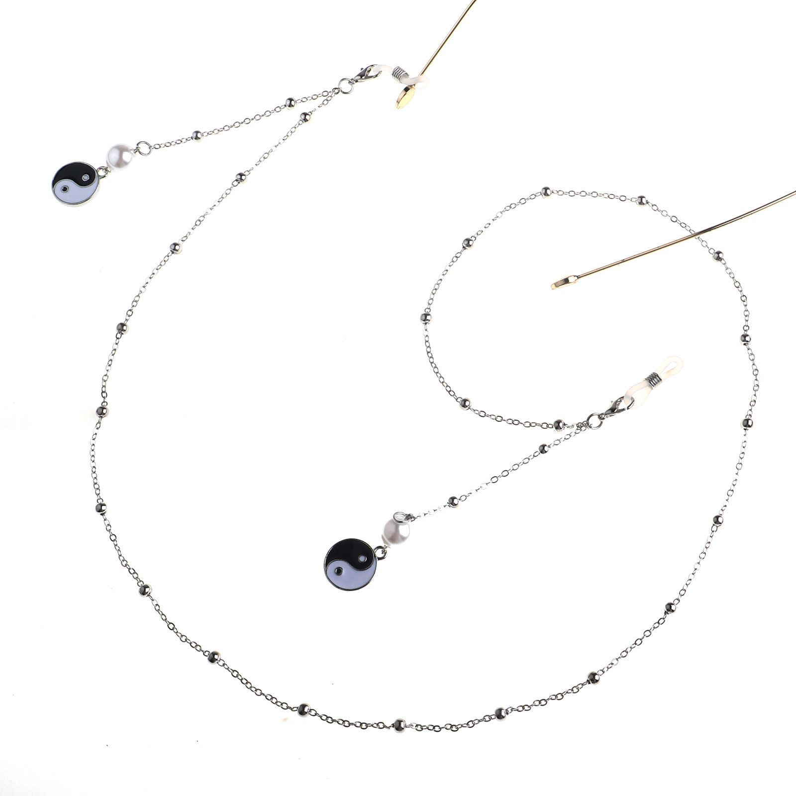 Silver-colored metal non-slip chain, with beads, pearl and clip-on, for glasses and masks GL783
