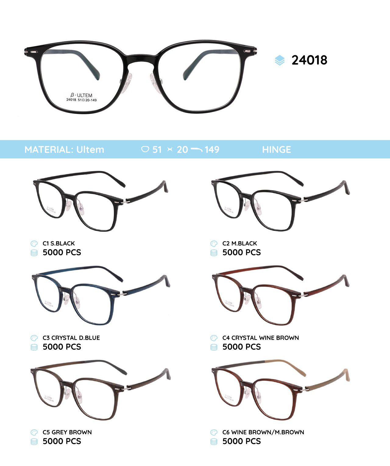 - Frame material: Ultem, metal
