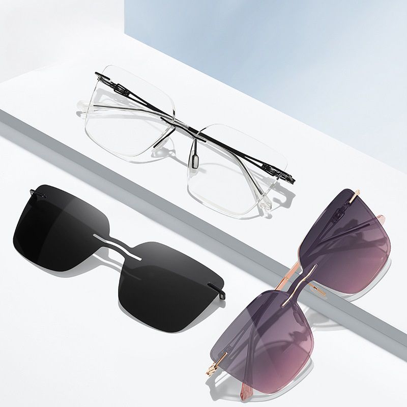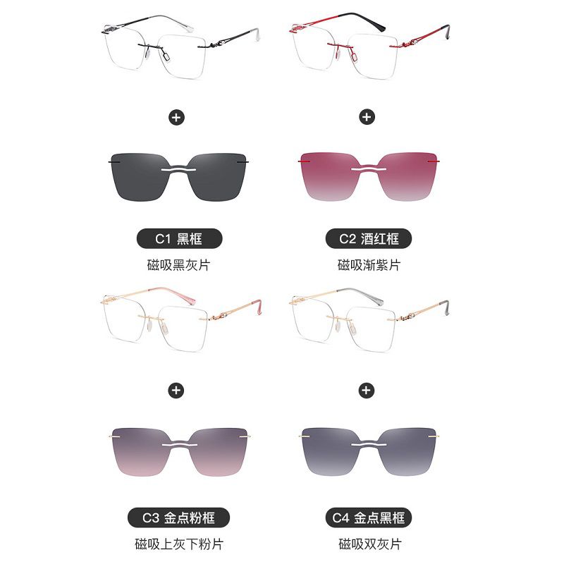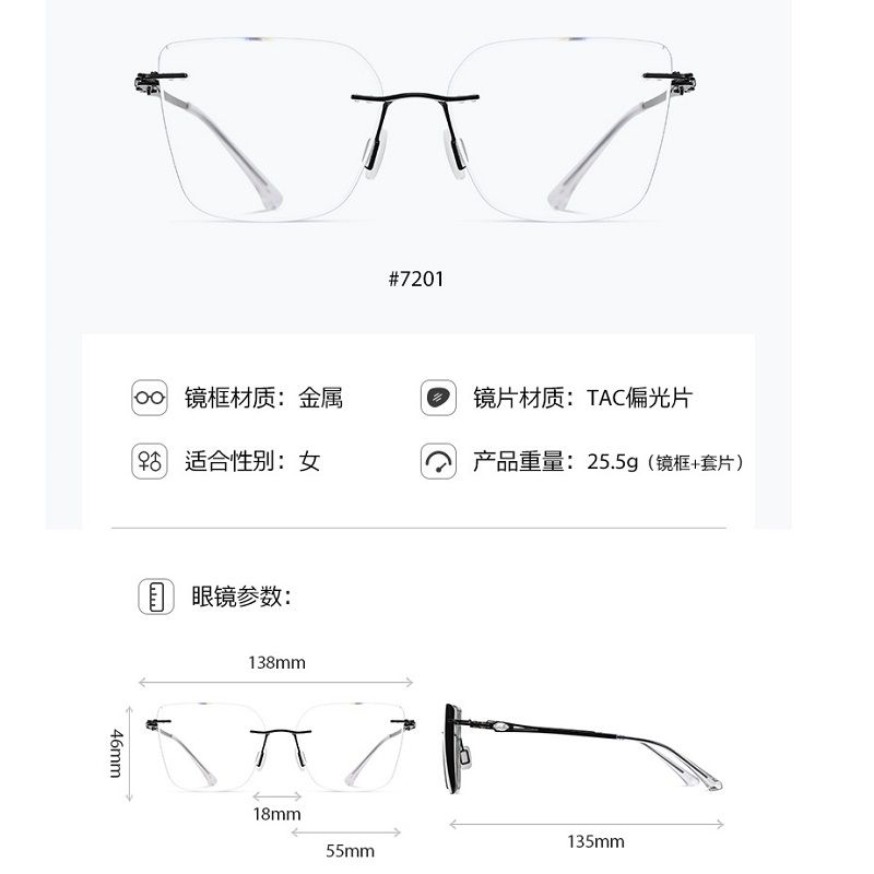 Metal rimless women's frame + magnet sunshade clip-on 7201-GT