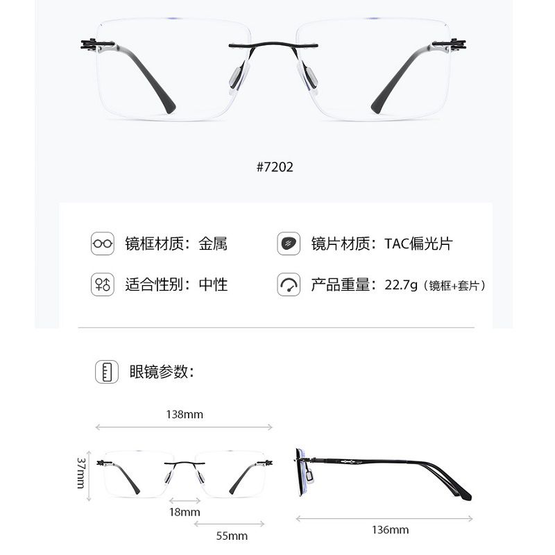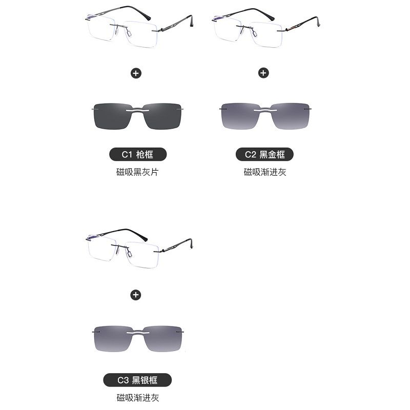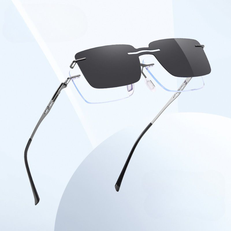 Metal rimless men's frame + magnet sunshade clip-on 7202-2-GT