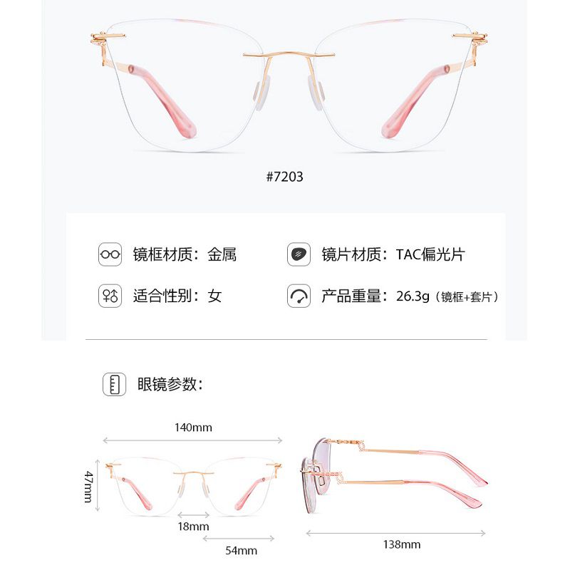 Metal rimless women's frame + magnet sunshade clip-on 7203-GT