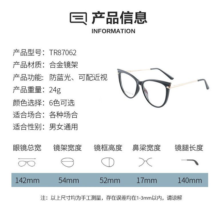 - Temple material: CP plastic, metal