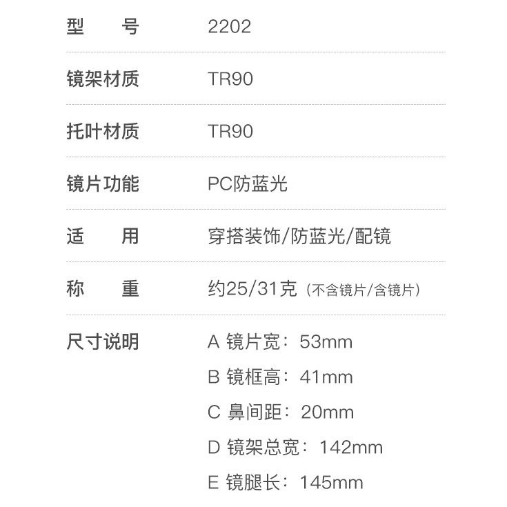 - Temple material: TR90 plastic, metal