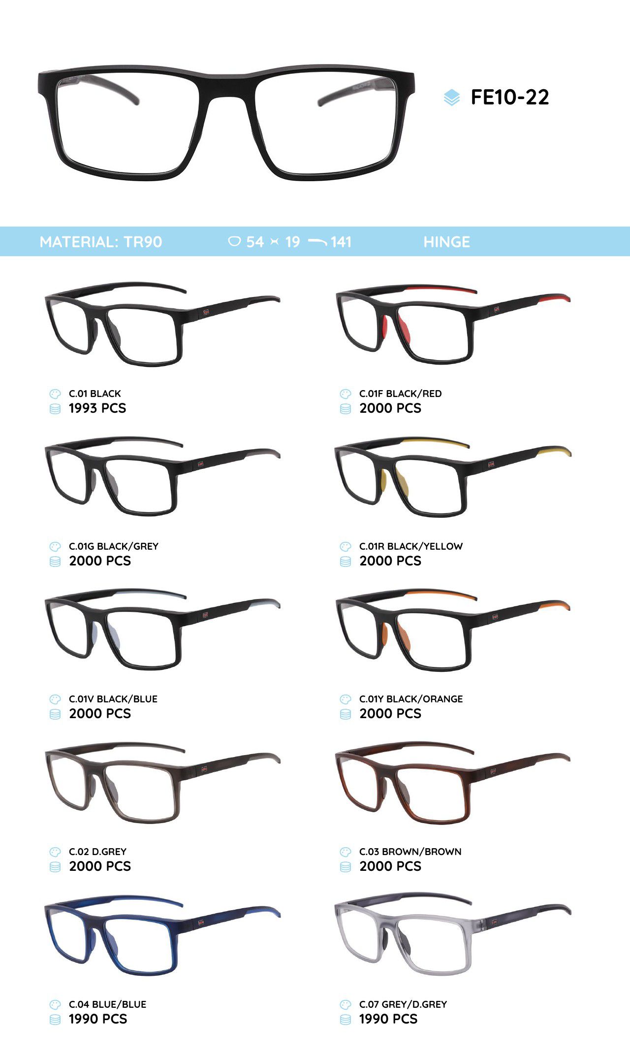 - Frame material: TR-90 plastic, silicone, metal
